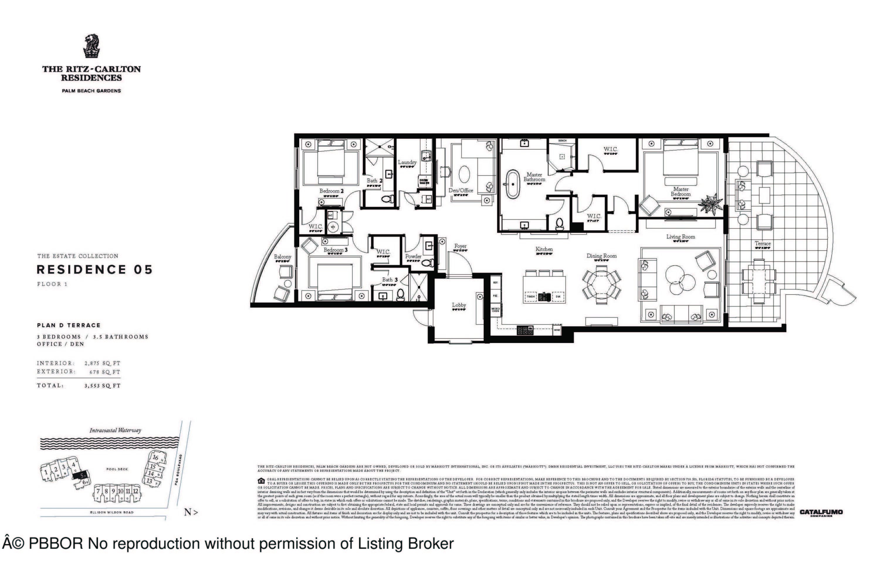Residence 105D Terrace is a one-of-a-kind floorplan. This 3BR+Den, 3.5BA home offers nearly 700 sq ft of private outdoor living, incl. a patio w/ direct access to terrace-level amenities 30 feet above the Intracoastal. Terrace-level amenities incl. putting greens, lush garden sanctuaries & immediate proximity to the resort-style infinity-pool & cabanas below. With over 20,000 sq. ft. of amenities, the residence showcases European oak-finish cabinetry, Wolf & Sub-Zero appliances w/ gas cooktop, & triple-pane floor-to-ceiling impact sliding glass doors framing expansive views. 2 garage spaces included. As an exclusive residential building w/ no hotel component, ownership combines the privacy of a dedicated community w/ the legendary services of The Ritz-Carlton. Expected Completion Mid-2026