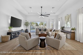 If you're searching for a fully upgraded, move-in-ready home where every detail has been thoughtfully considered, 12676 Nautilus Circle delivers a truly turnkey living experience in one of Palm Beach Gardens' most desirable communities. This beautifully upgraded 3-bedroom, 2.5-bath residence with a dedicated office/den is located in the sought-after community of Avenir Palm Beach Gardens and offers refined finishes and meaningful enhancements throughout. The open-concept layout is enhanced by custom window treatments, custom hardwood wainscoting in the dining room, and a well-designed kitchen with ample storage, under-cabinet lighting, and subtle statement finishes. Designer light fixtures from RH, Pottery Barn, and Arhaus elevate the home's aesthetic, while custom storage solutions are thoughtfully integrated throughout. The living spaces are further complemented by built-in in-ceiling speakers in the living room and exterior Sonance speakers, creating a seamless environment for everyday living and entertaining. The primary suite serves as a relaxing retreat with custom his-and-hers closets and a well-appointed bath. Step outside to a private backyard oasis featuring a stunning marble infinity-edge pool with electric heater, low-maintenance turf, and extensive upgraded landscaping surrounding the property. The covered lanai includes a retractable solar screen and a fully built-in summer kitchen with quartzite countertops, grill, trash pullout, and beverage refrigeratorideal for effortless indoor-outdoor living. Further enhancements include a 24KW Generac whole-house generator, epoxy-coated garage floors with functional storage and fitness space, a fully fenced backyard with an extended fence line, and numerous other thoughtful upgrades throughout. Residents enjoy access to Avenir's impressive East Clubhouse, featuring a resort-style pool, state-of-the-art fitness center, tennis and pickleball courts, and beautifully designed social spacesdelivering an exceptional Palm Beach Gardens lifestyle.