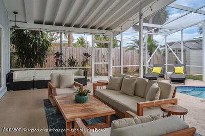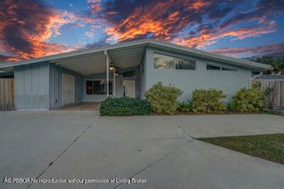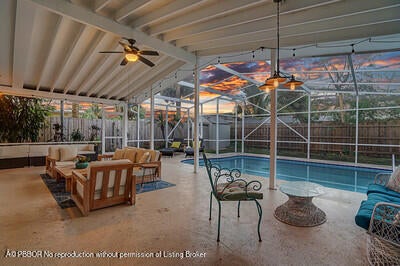 This beautifully upgraded vaulted-ceiling mid-century single-family home in Palm Beach Gardens features 3 bedrooms and 2 bathrooms, with no HOA fees. Recent renovations include a new roof (2018), solar panels (2022), HVAC (2022), upgraded plumbing, and new electrical systems (2022).The interior features coastal porcelain tile, a contemporary kitchen equipped with gas appliances, and renovated bathrooms. It offers seamless indoor-outdoor living, highlighted by a spacious covered patio that leads to a private pool, which is enhanced by a new oversized screened enclosure, ideal for entertaining. Additional highlights include a spacious carport, extra storage, a fenced yard suitable for children and pets, new landscaping, a sprinkler system, and ambient lighting. This property is truly a must see!