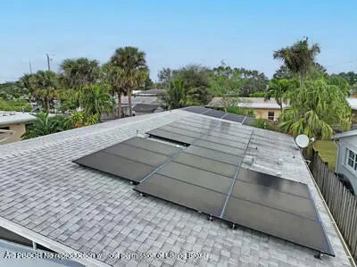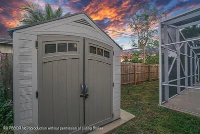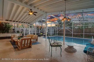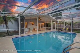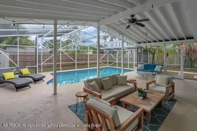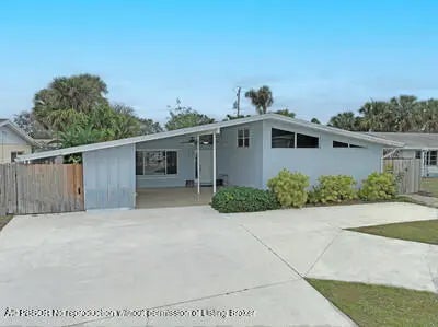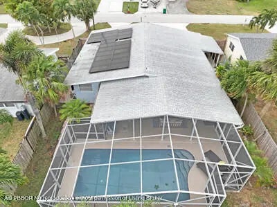 This beautifully upgraded vaulted-ceiling mid-century single-family home in Palm Beach Gardens features 3 bedrooms and 2 bathrooms, with no HOA fees. Recent renovations include a new roof (2018), solar panels (2022), HVAC (2022), upgraded plumbing, and new electrical systems (2022).The interior features coastal porcelain tile, a contemporary kitchen equipped with gas appliances, and renovated bathrooms. It offers seamless indoor-outdoor living, highlighted by a spacious covered patio that leads to a private pool, which is enhanced by a new oversized screened enclosure, ideal for entertaining. Additional highlights include a spacious carport, extra storage, a fenced yard suitable for children and pets, new landscaping, a sprinkler system, and ambient lighting. This property is truly a must see!