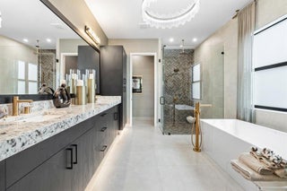 BUILDER MODEL HOME – FULLY FURNISHED! Discover the Manhattan Model at Solana Bay, a 5 Bed / 6 Bath lake-view home featuring two primary suites, a gym, den, loft, and media room. Filled with natural light, this open-concept design offers high ceilings, 32x32 porcelain tile, and an extra-large chef-inspired kitchen with quartz countertops, oversized island, stainless steel appliances, wall oven, built-in microwave, 42" cabinets, and a natural gas cooktop. Includes a 2-car garage, tankless water heater, gas dryer, impact windows/doors, smart home automation, and alarm monitoring. Enjoy a private pool with hot tub and outdoor summer kitchen. Community amenities include a resort-style heated pool, lap pool, tennis, pickleball, fitness center, and cabanas. Square footage approx.