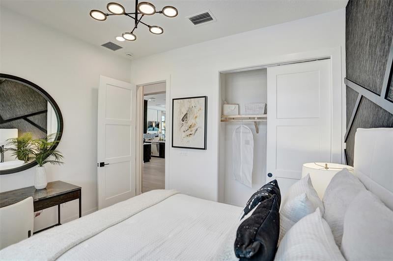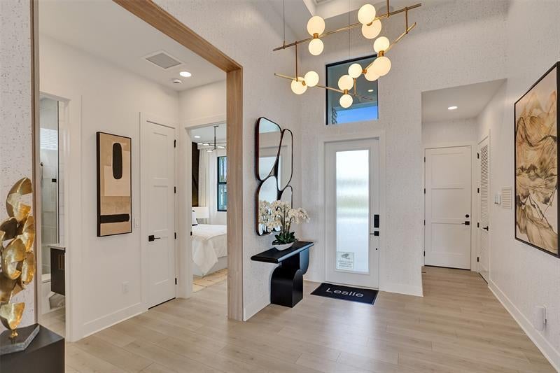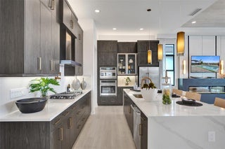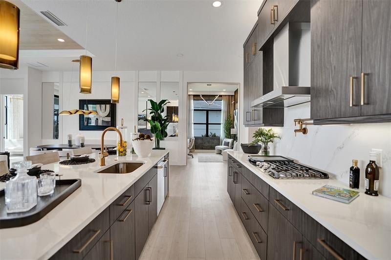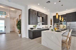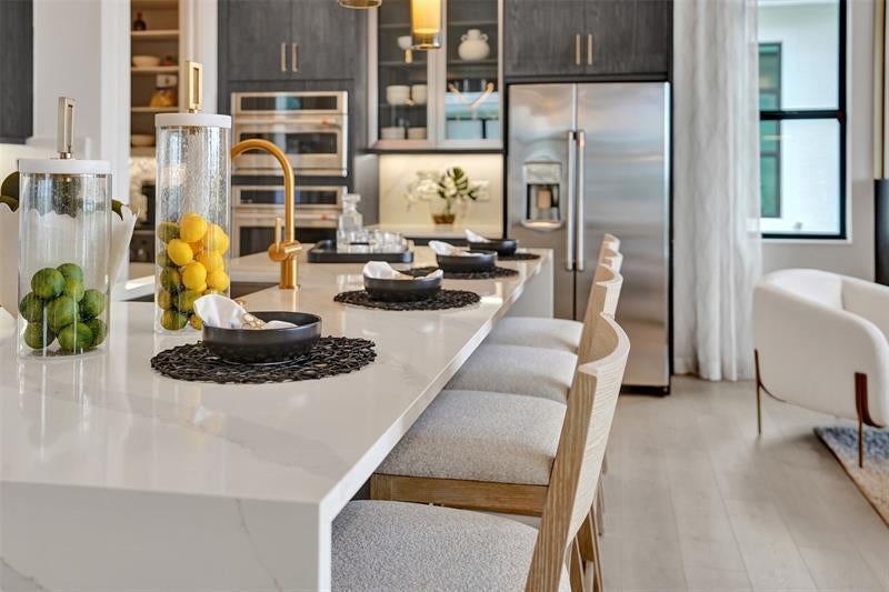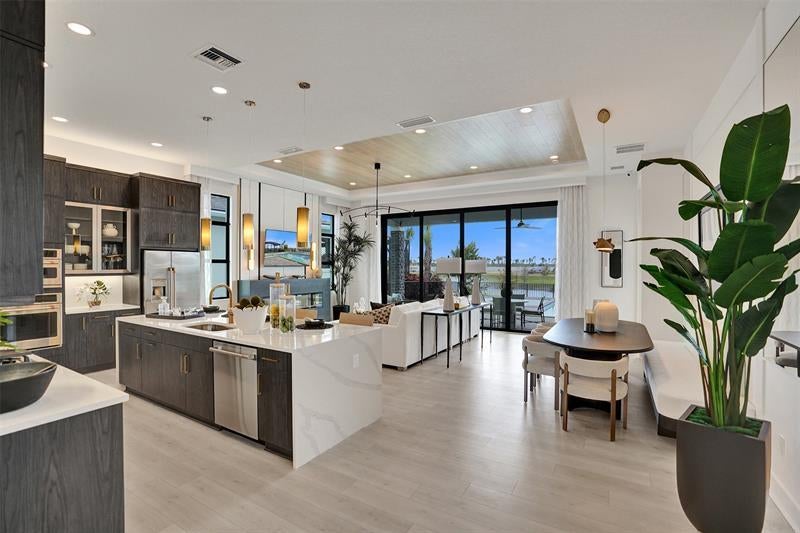 This Leslie is situated on a southern facing homesite in the new 55+ Esprit community. It includes 3beds/3 baths, and a 3-car garage. The owner’s suite and lanai have been extended by 4’ and a 16-foot wide by 10-foot tall sliding glass door connects the great room to the lanai, which also features an outdoor summer kitchen. Inside, the kitchen comes with gas cooking, an upgraded built-in pantry, a waterfall style quartz island, and second tier upper cabinets. The owner’s shower has been extended to the deluxe shower and the great room comes with a 74” electric fireplace. This Leslie also includes a tankless gas water heater and spray foam insulation for added energy efficiency. Photos of a decorated model home are for reference only. Actual home will differ.