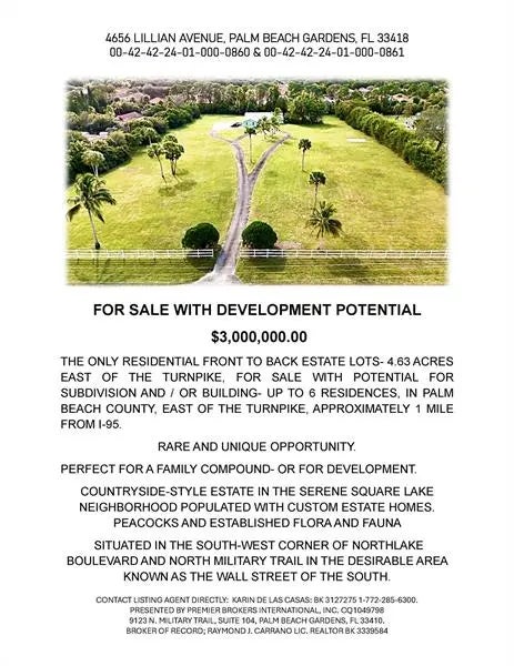 The home is situated on 4.63 Acres, the largest residential lot available in all of Palm Beach County East of the Florida Turnpike. With potential for subdividing up to 6 parcels, also ideal for a Family Compound. Located in the Palm Beach Gardens area coming to be known as: 'The Wall Street of the South', it's just one turn off the Northlake Boulevard and North Military Trail metropolitan area, to the serenity of the Square Lake neighborhood populated with peacocks, horses and custom estate homes. This 1972 home is structurally sound with a beautiful layout, in need of updating. The 4.63 acres consists of two nearly identical 2.31+ acre lots situated front to back onto Lillian Avenue. City Water availablePCN 00-42-42-24-01-000-0861 2.32 Acres PCN 00-42-42-24-01-000-0860 2.31 Acres Complete Survey is Pages 1 & 2.Professional Architect and Planner's Due Diligence Statement for Property's Highest and best use available to qualified Buyers upon request.