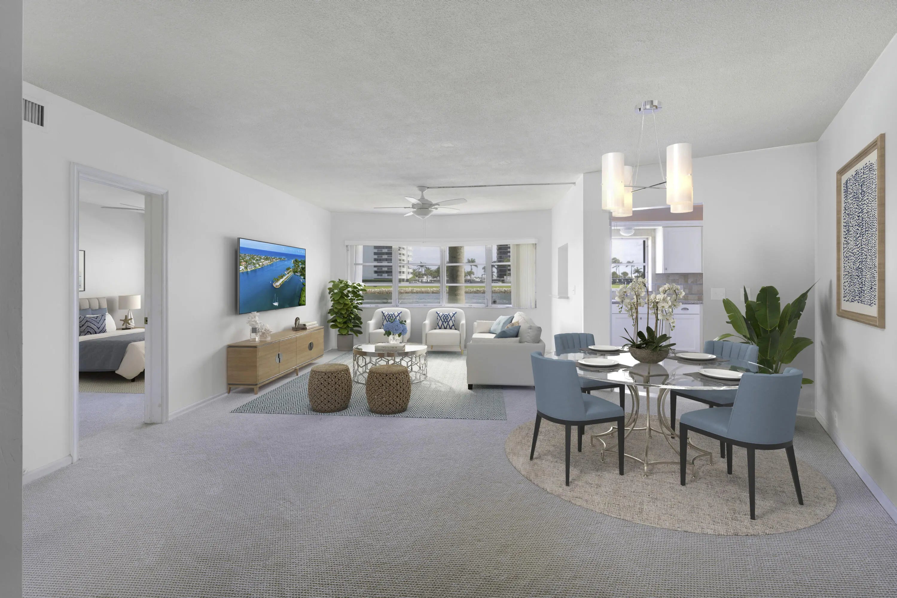 Enjoy the sweeping Intracoastal views in this first floor 2 bedroom, 2 bath condo in the highly sought-after community of North Palm Beach. Total Sq. Ft. 1,094 Living Sq. Ft. 1,094 55+ community First floor end unit, 2 bedroom 2 bath Water views from almost every room Open dining area. Large living area has ceiling fan with lighting.Bright kitchen has granite counter tops with full tile backsplash, a full complement of appliances including cooktop stove, wall microwave, dishwasher and refrigerator Master bedroom has carpet flooring, walk-in closet and ceiling fan Master bath has tile floors, tub/show combo and vanity Guest bedroom has carpet and reach-in closet. Guest bath has vanity and enclosed shower.Amenities include community pool, clubhouse, common laundry, library and fitness room. North Palm Beach features several beautiful parks, such as Anchorage Park, with playgrounds, docks, volleyball courts, tennis courts, and a dog park. The Village is also home for the newly renovated North Palm Beach Country Club, featuring an Olympic swimming pool, splash pad, picnic area, an on-deck tiki hut, 200 seat banquet room, 100 seat Farmer's Table restaurant, A Jack Nicklaus Signature Golf Course, and a full featured Tennis Facility with Har-Tru courts. Close to beaches, recreation, dining and entertainment. Easy access to major highways and Palm Beach International Airport. 2 year waiting period to lease.