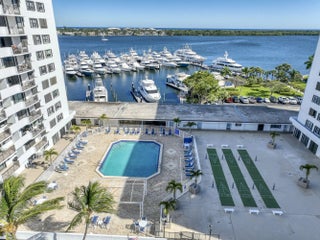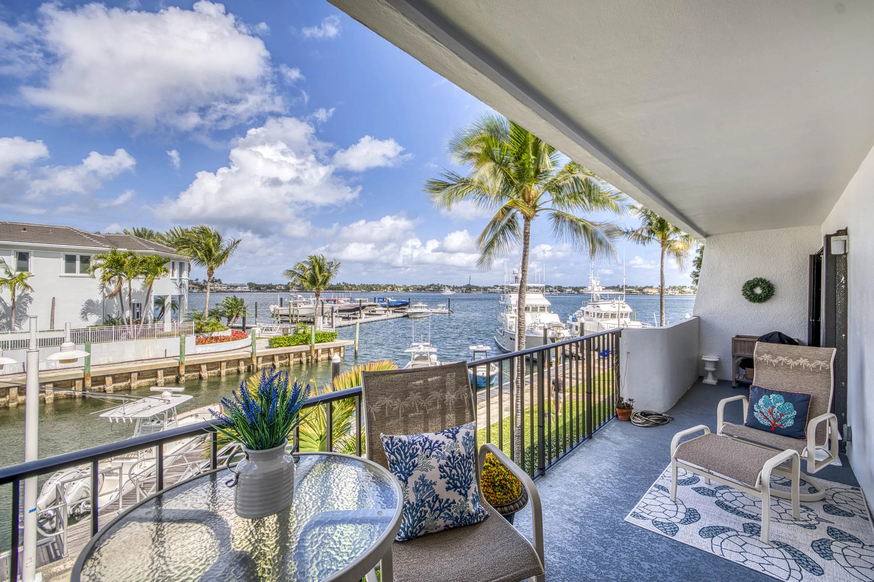 This is not just a condo, it's one of the most exclusive waterfront opportunities in all of Old Port Cove. One of only 14 coveted garden-style residences, this exceptionally rare offering lives like a private villa with no neighbors above or below, a true unicorn in waterfront condominium living. From the moment you step onto your expansive 50-foot covered balcony, you're met with sweeping views of the sparkling Lake Worth Lagoon, million-dollar vistas that feel endless and ever-changing. Sunrise coffees, evening cocktails, boat watching, ocean breezes, this is the South Florida lifestyle at its finest. Boating enthusiasts will appreciate the ability to rent a boat slip at the nearby Safe Harbor Marina, located just outside your door, offering effortless access to the Intracoastal and beyond. Enjoy waterfront dining at Belle's, the onsite restaurant just a short stroll away, or take advantage of the scenic two-mile walking trail that winds along the water, all privately nestled behind the gates of Old Port Cove. Perfectly positioned just steps from the pool and tennis courts, yet tucked away for privacy, this residence offers the best of both worlds. Assigned covered garage parking adds convenience and peace of mind. Inside, the thoughtfully designed split floor plan features an open great room ideal for entertaining and two generously sized primary suites, creating comfort and flexibility for guests. Tile flooring flows throughout, complemented by impact windows, granite kitchen countertops, elegant crown molding, and a sleek, space-saving all-in-one washer-dryer. Furniture may be included, offering a seamless, turnkey opportunity for the discerning buyer seeking immediate enjoyment. Opportunities like this rarely come available and almost never with this level of privacy, exclusivity, boating access, and unobstructed million-dollar views of the shimmering Lake Worth Lagoon, a rare waterfront vantage point few ever get to own.