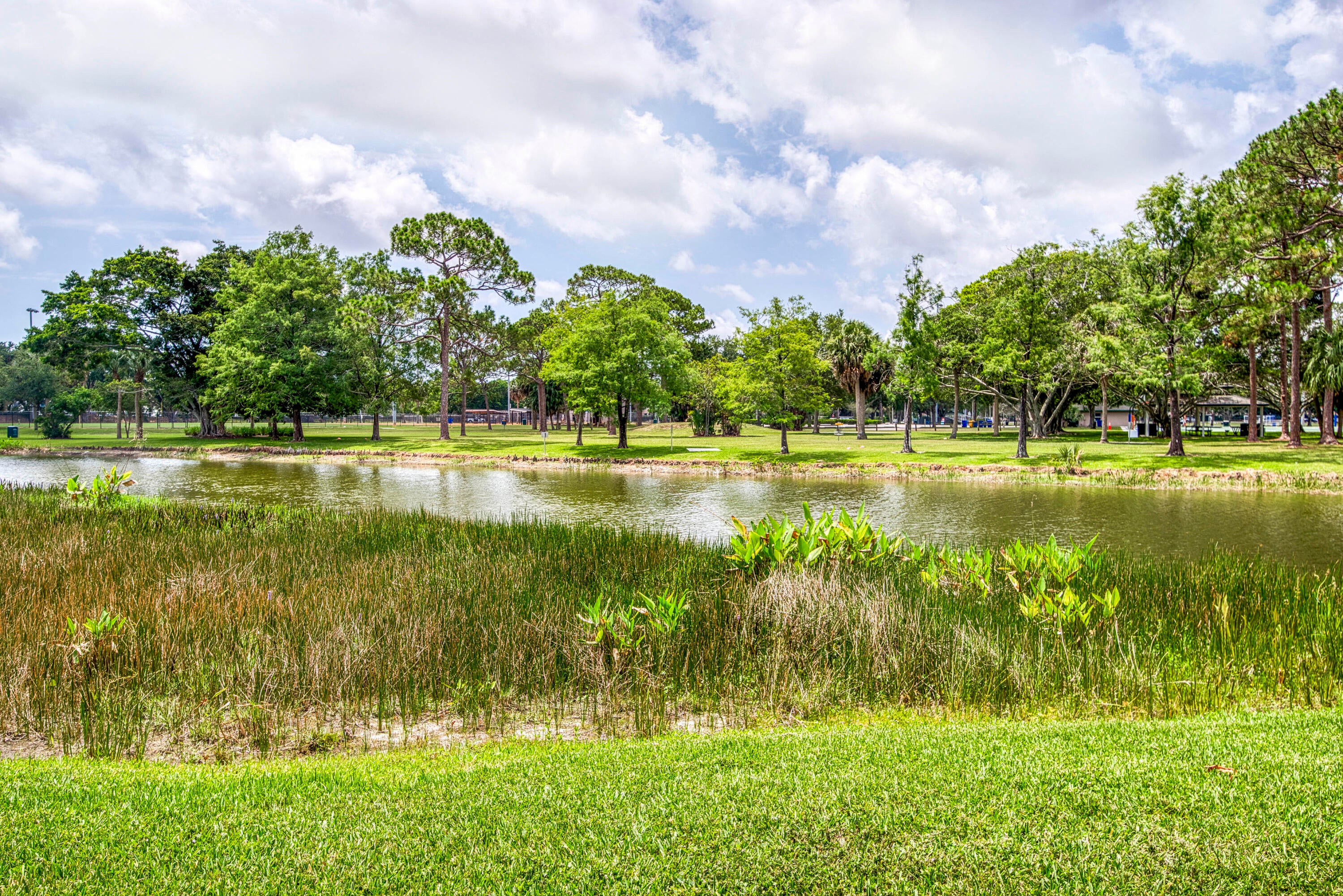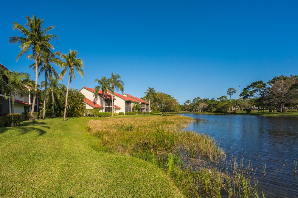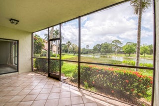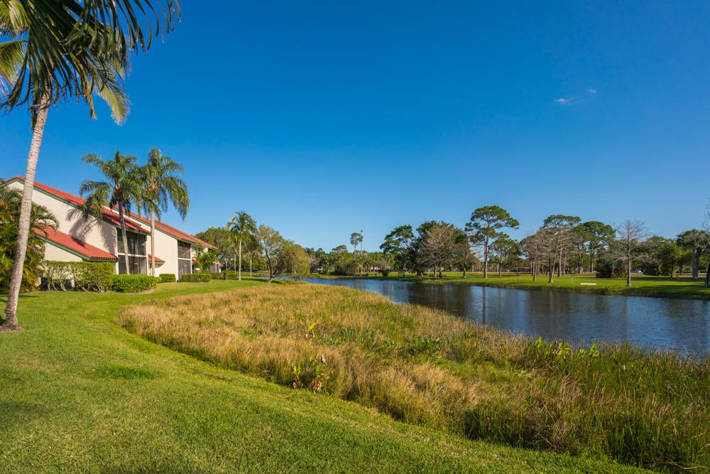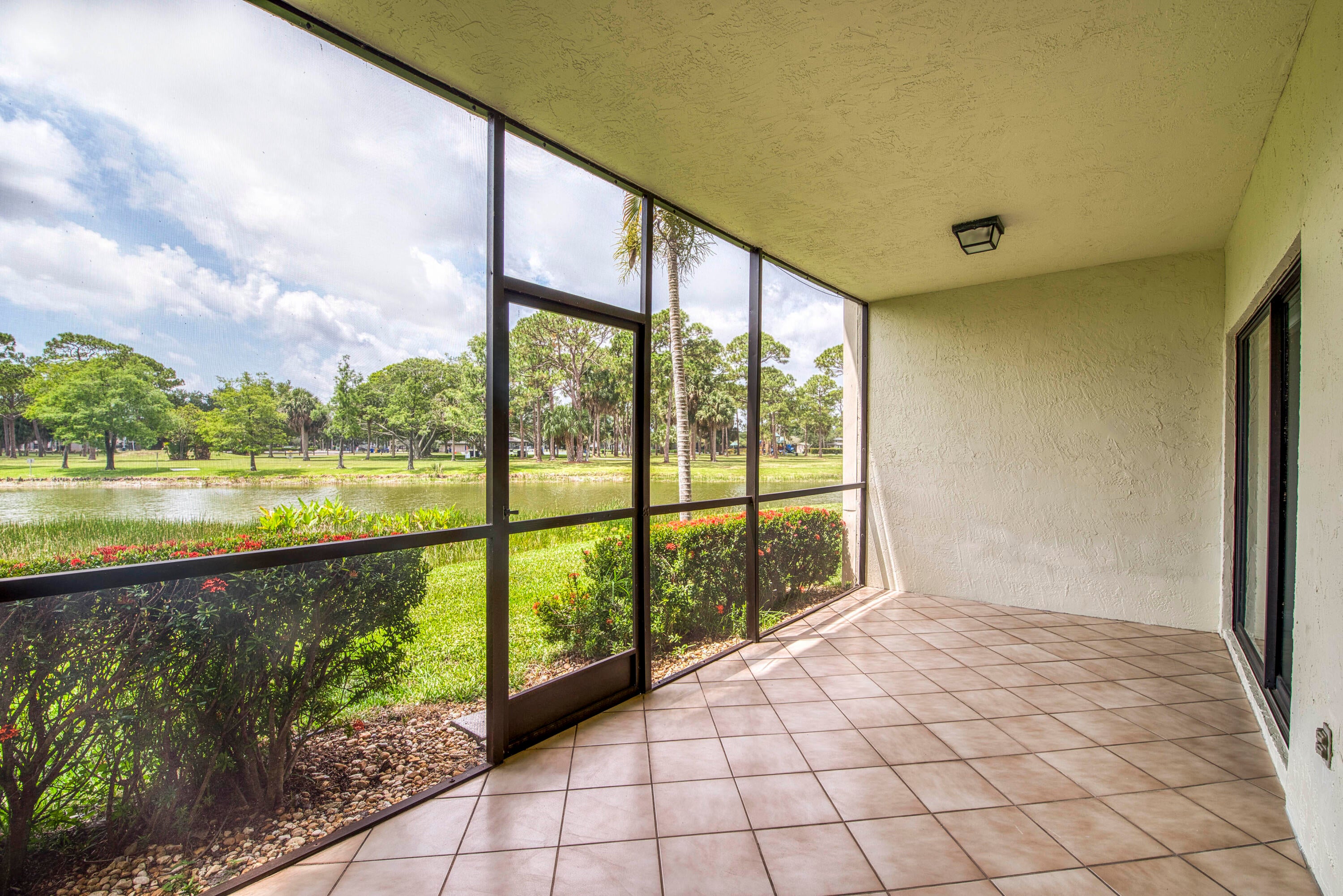 Super updated 2 bedroom condo with garage in PGA! This lovely ground floor unit has womderful views of a picturesque pond and landscaped park you can enjoy from your spacious and sunny screened patio. Gorgeous white Shaker cabinetry has dove-tailed, soft closing drawers to compliment the rustic granite counters in this open kitchen. The floors are porcelain ''wood look'' planks with minimal grout lines. Brand new refrigerator and stainless appliances are in excellent condition. The condo is fresh and beautiful, painted a neutral tone, and is move-in ready! 2016 upgrades include custom remote Hunter Douglas blinds, washer/dryer, AC, and water heater.Community features private pool and location in PGA with no required membership.