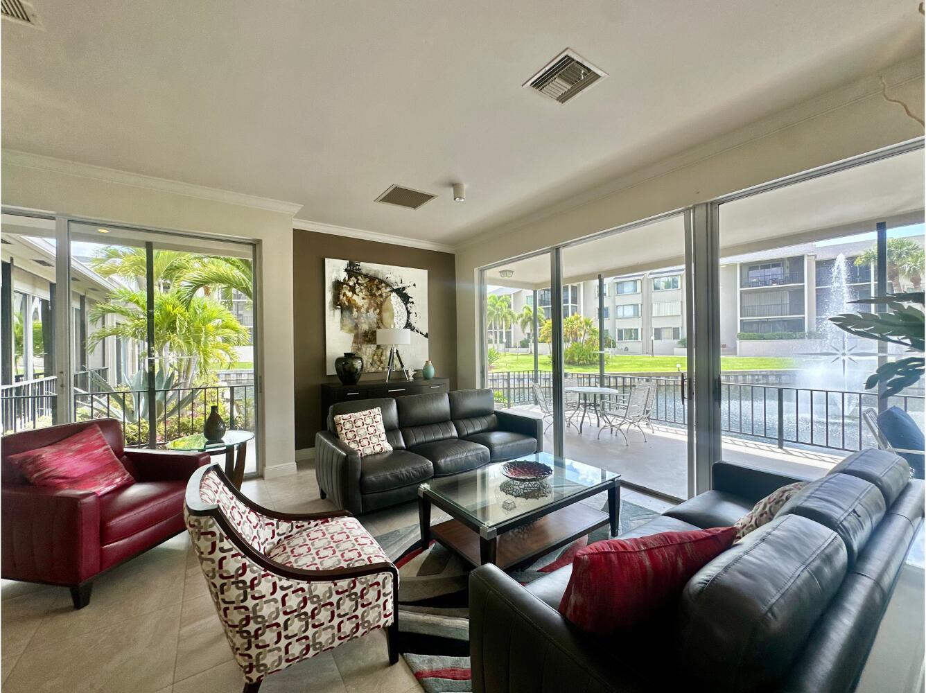 Stunningly renovated, 2 bedroom, 2-full bathroom, first-floor corner unit with spacious screened wrap-around patio with tons of natural light throughout! Sprawling an impressive 1,537 sq.ft. under air, and 1,726 sq.ft. total, this unit is a showstopper! Brand new luxury vinyl plank wood-look floors throughout, new kitchen cabinetry, countertops and backsplash. Stainless appliances. Gorgeous, modern bathrooms with new vanities, fixtures and tile. New 2025 AC Handler. Ample storage. Walk out of your screened patio to the waterfront community-pool and outdoor kitchen/bar with two grills, stunning clubhouse with indoor wet bar, kitchenette, dining table and sofas with TV overlooking the lake with fountains. Pickleball courts and more. Shopping & Dining in walking distance! (PLS SEE SUPPLEMEN