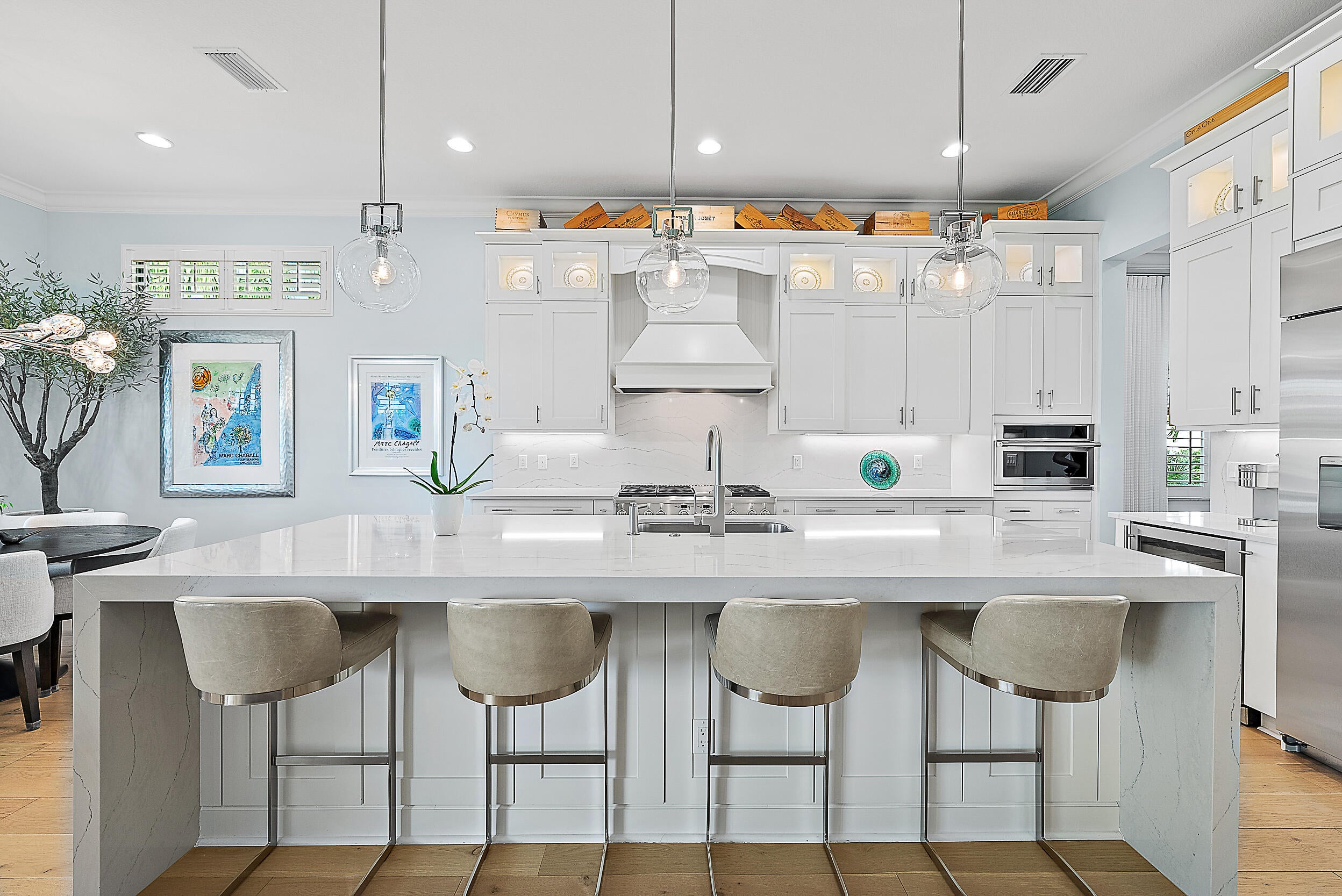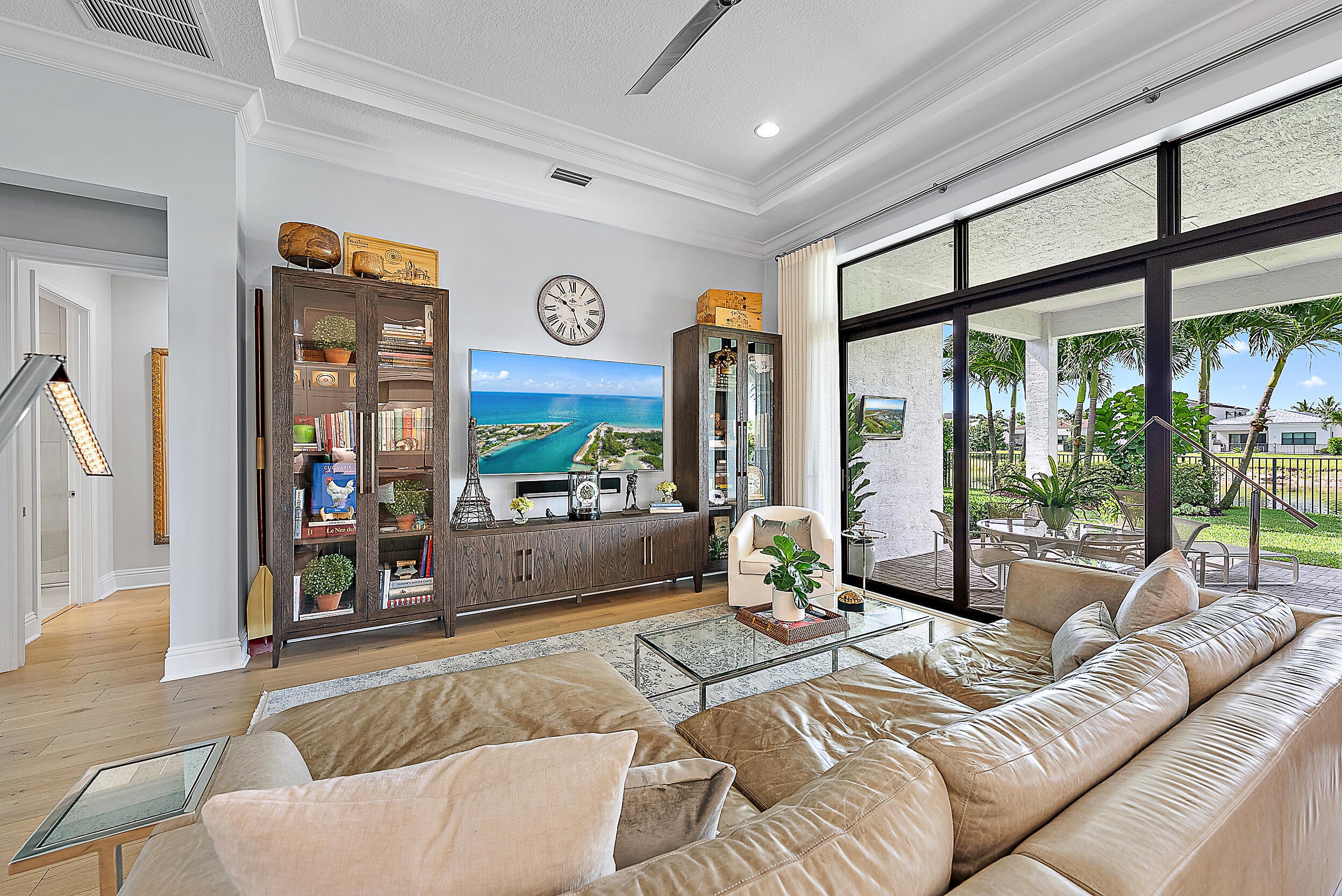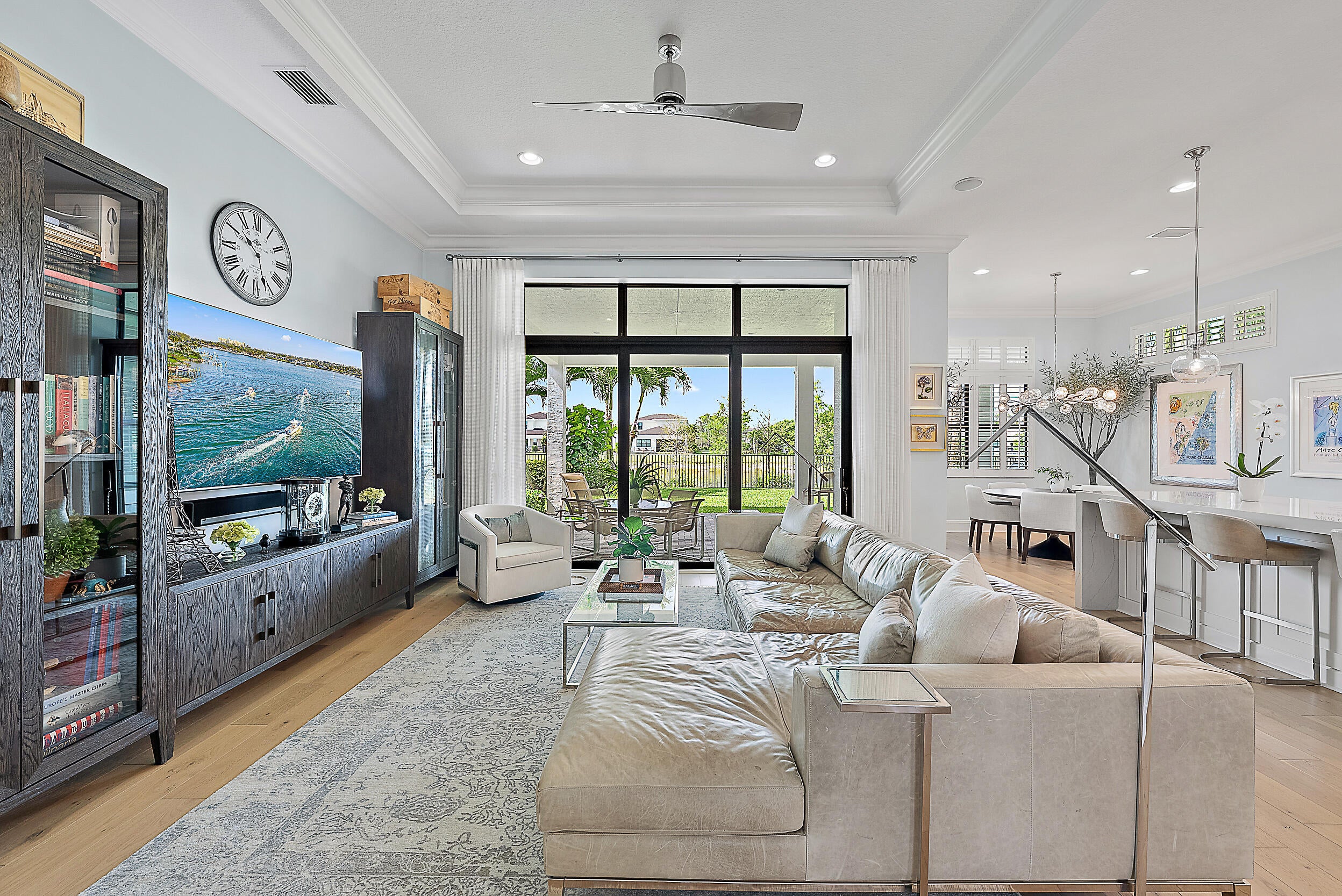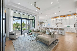 Perfectly situated in the center of Artistry, this home offers a peaceful water view and desirable southern exposure, filling the interior with natural light throughout the day. With an easement between you and the next-door neighbor, you'll enjoy a greater sense of privacy and space, rarely found in this community. Inside, tasteful upgrades and designer finishes create a polished yet comfortable atmosphere. White oak flooring, quartz surfaces, beautiful crown molding, and upscale fixtures are featured throughout. A versatile front room sets the stage for entertaining or formal gatherings, while the chef's kitchen delivers top-tier performance with GE Monogram appliances, a 6-burner gas range with griddle, three ovens, an oversized waterfall island, wine cooler, andupgraded cabinetry. The spacious primary suite overlooks the water and includes multiple walk-in closets. The en-suite bath features floor-to-ceiling tile, creating a spa-like retreat with a clean, modern look. Upstairs, you'll find well-appointed guest suites and a separate living area ideal for extended family, visiting guests, or a private retreat for kids or teens. Located in the gated community of Artistry Palm Beach, residents enjoy a modern clubhouse, resort-style pool, state-of-the-art fitness center, playground, and scenic walking trails. All just minutes from A-rated schools, world-class golf, beaches, and fine dining in Palm Beach Gardens.