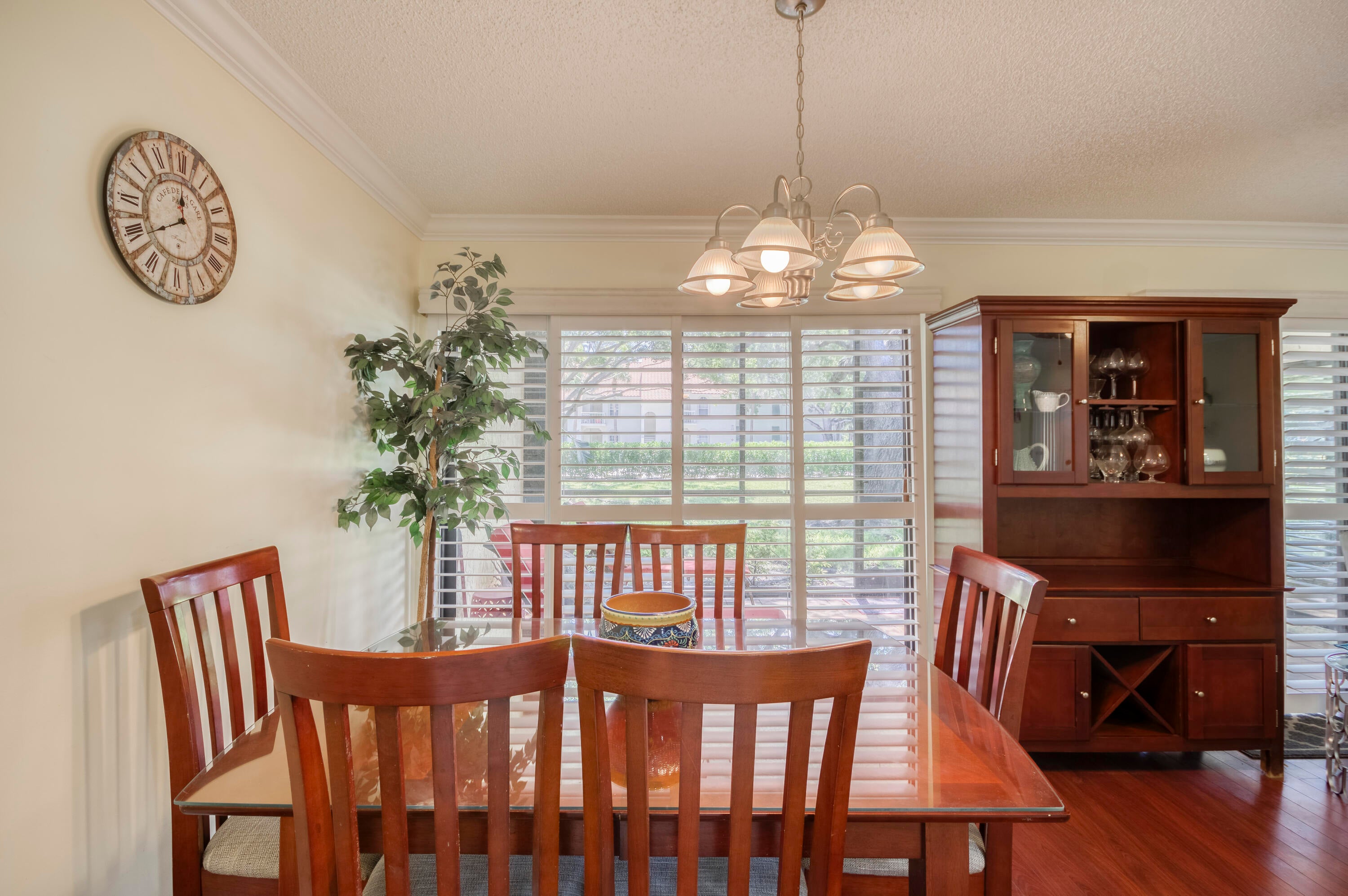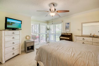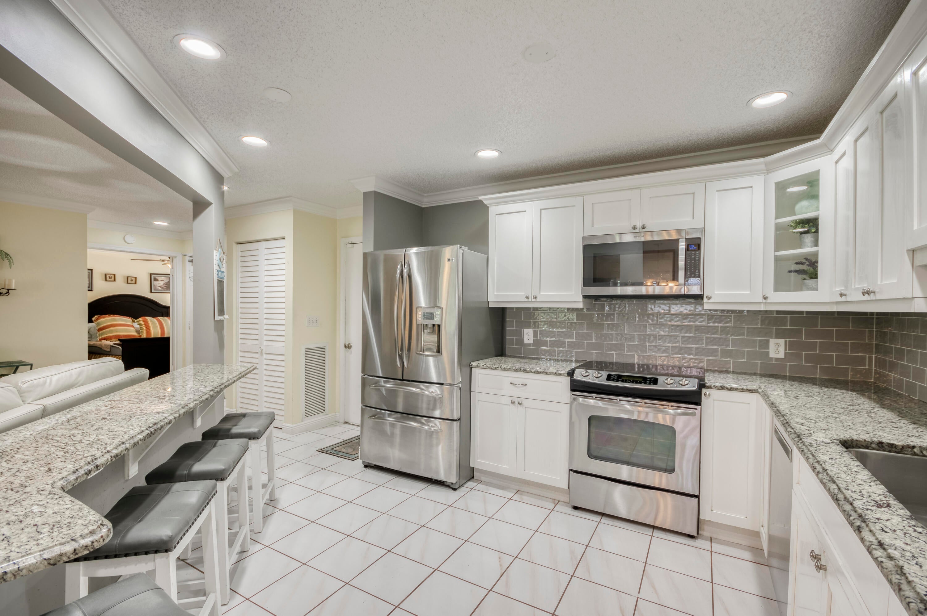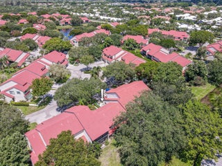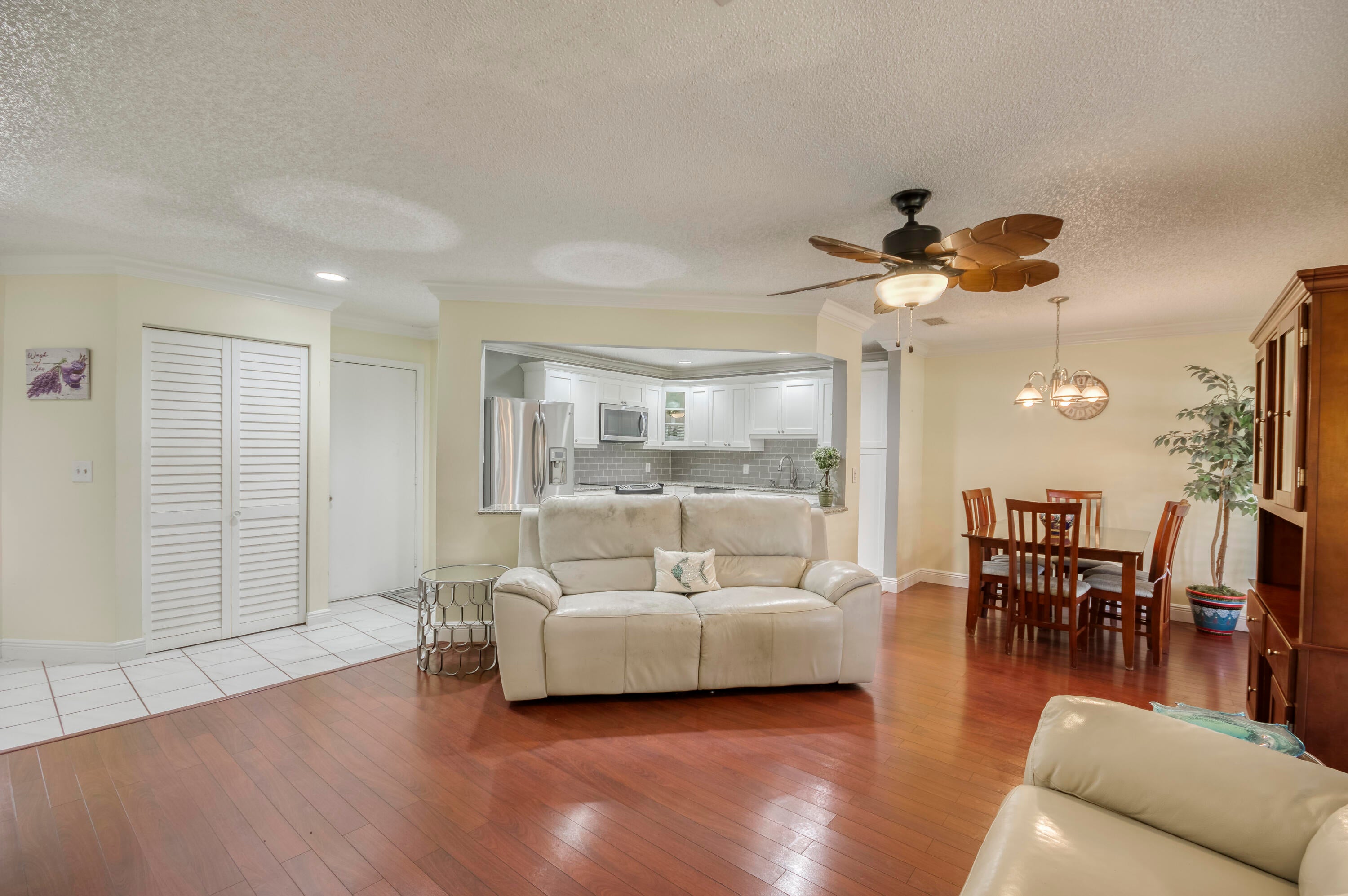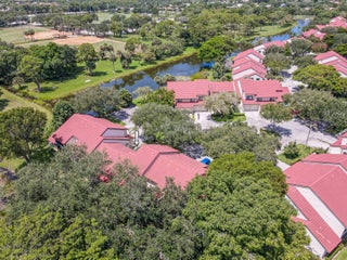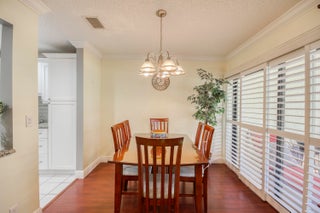 Welcome to this charming and light-filled first-floor condo in the desirable Lexington Green community of PGA National. Ideally positioned on a peaceful southeast corner lot, the home offers tranquil front-facing canal views and lush garden scenery in the rear. Blending an open layout with timeless Southern charm, it features warm cherry wood laminate flooring, a soft buttery cream and greige color palette, and crisp white plantation shutters throughout. The bright living and dining areas each enjoy sliding glass doors that fill the space with natural light and offer seamless flow to the screened, covered patio, perfect for lounging or dining in the shade of mature tropical landscaping. The updated kitchen (2017) is both stylish and functional, showcasing marble-look ceramic tileflooring, white shaker cabinets, granite countertops, a coordinating subway tile backsplash, stainless steel appliances, recessed lighting, a snack bar with seating, and a pass-through window that opens to the main living area. The spacious primary bedroom continues the home's soft color scheme and features plush neutral carpeting, sliding doors with patio access, and ample closet space. The shared bathroom is tranquil and tastefully finished with neutral tile, a large shaker-style vanity topped with clay-toned granite, and soft lighting for a spa-like feel. A bright and airy guest room offers flexibility as a bedroom, office, or both. Additional highlights include a one-car garage with convenient access to the washer and dryer, storm protection with a combination of accordion shutters and impact-rated windows and doors, and a location within walking distance of the community pool. Enjoy low-maintenance living and the lifestyle of PGA National in a condo that feels like home, full of charm, light, and inviting indoor-outdoor spaces.