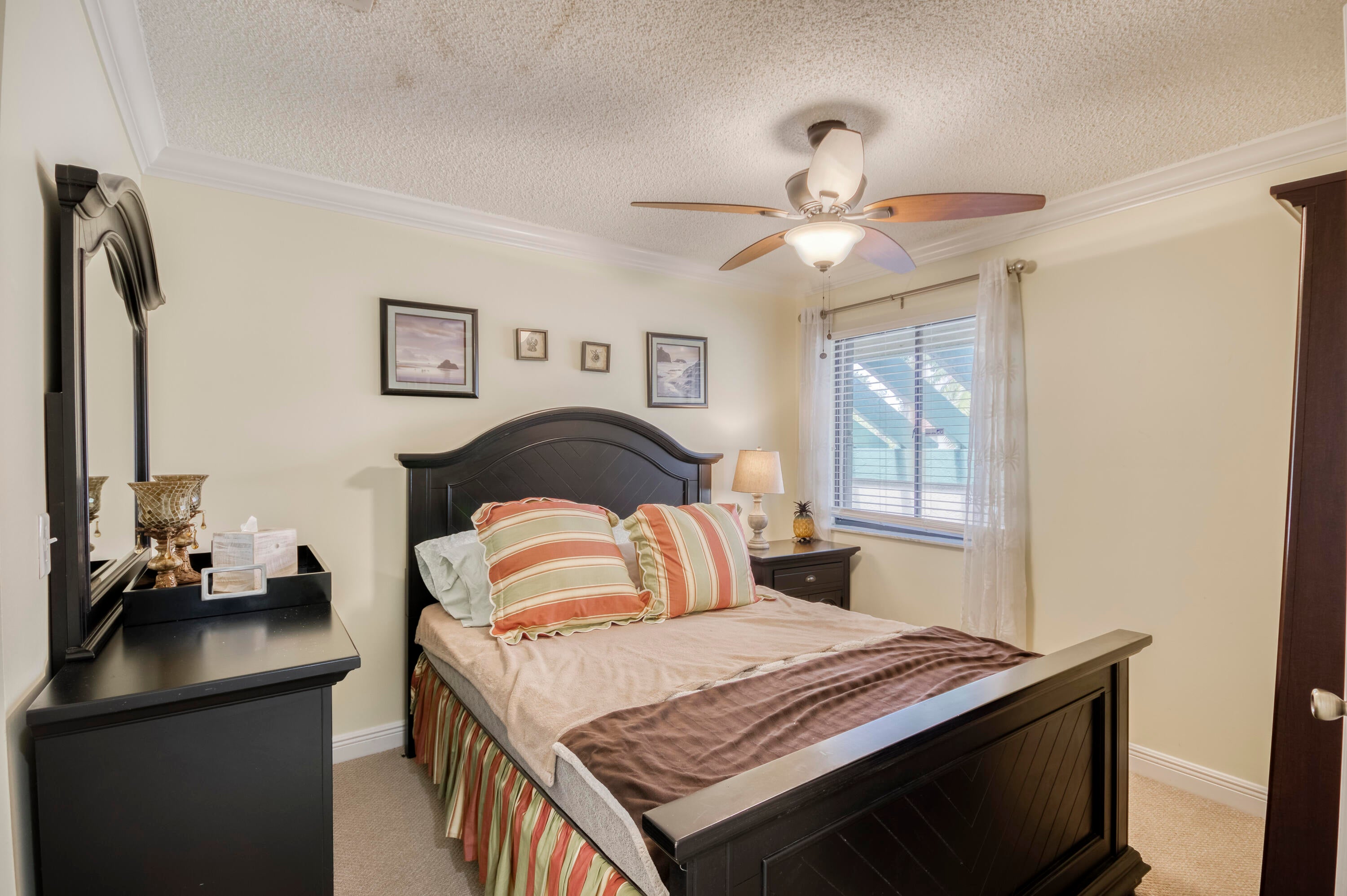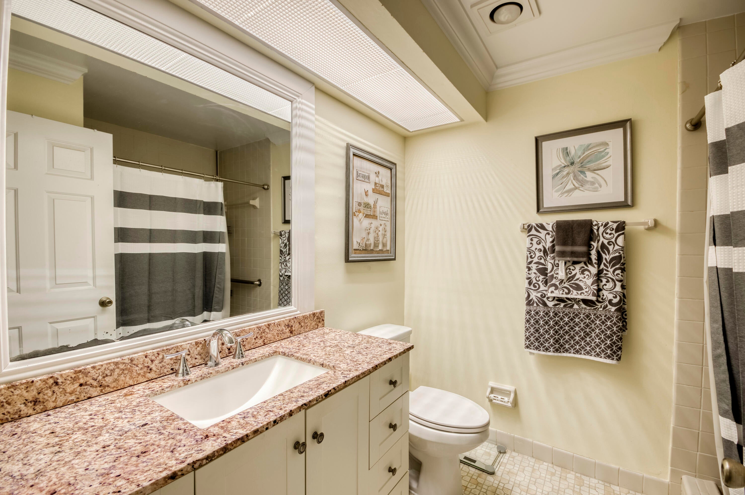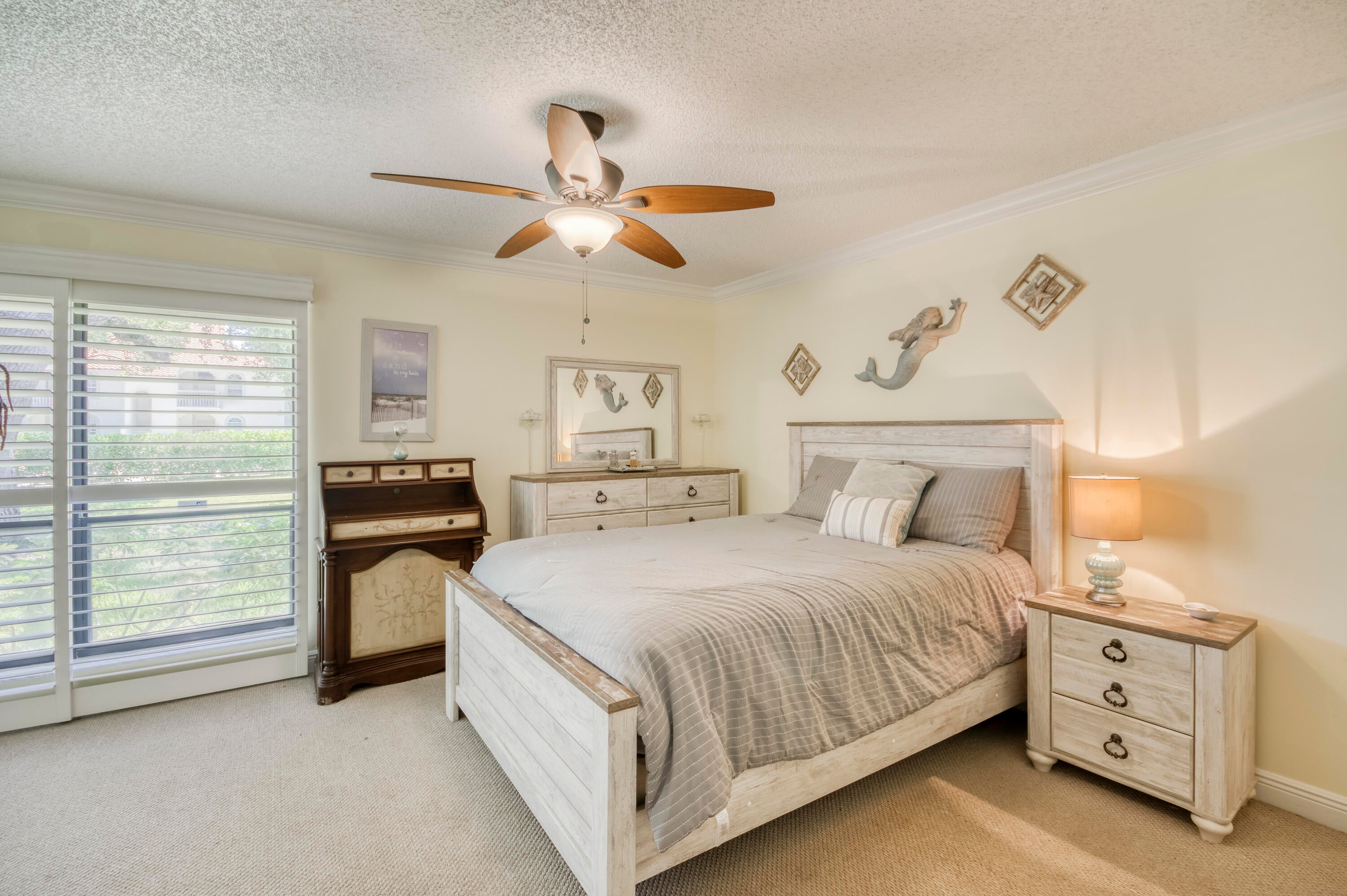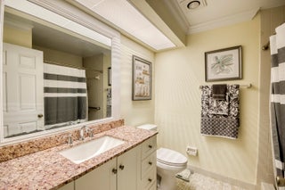 Welcome to this charming and light-filled first-floor condo in the desirable Lexington Green community of PGA National. Ideally positioned on a peaceful southeast corner lot, the home offers tranquil front-facing canal views and lush garden scenery in the rear. Blending an open layout with timeless Southern charm, it features warm cherry wood laminate flooring, a soft buttery cream and greige color palette, and crisp white plantation shutters throughout. The bright living and dining areas each enjoy sliding glass doors that fill the space with natural light and offer seamless flow to the screened, covered patio, perfect for lounging or dining in the shade of mature tropical landscaping. The updated kitchen (2017) is both stylish and functional, showcasing marble-look ceramic tileflooring, white shaker cabinets, granite countertops, a coordinating subway tile backsplash, stainless steel appliances, recessed lighting, a snack bar with seating, and a pass-through window that opens to the main living area. The spacious primary bedroom continues the home's soft color scheme and features plush neutral carpeting, sliding doors with patio access, and ample closet space. The shared bathroom is tranquil and tastefully finished with neutral tile, a large shaker-style vanity topped with clay-toned granite, and soft lighting for a spa-like feel. A bright and airy guest room offers flexibility as a bedroom, office, or both. Additional highlights include a one-car garage with convenient access to the washer and dryer, storm protection with a combination of accordion shutters and impact-rated windows and doors, and a location within walking distance of the community pool. Enjoy low-maintenance living and the lifestyle of PGA National in a condo that feels like home, full of charm, light, and inviting indoor-outdoor spaces.