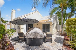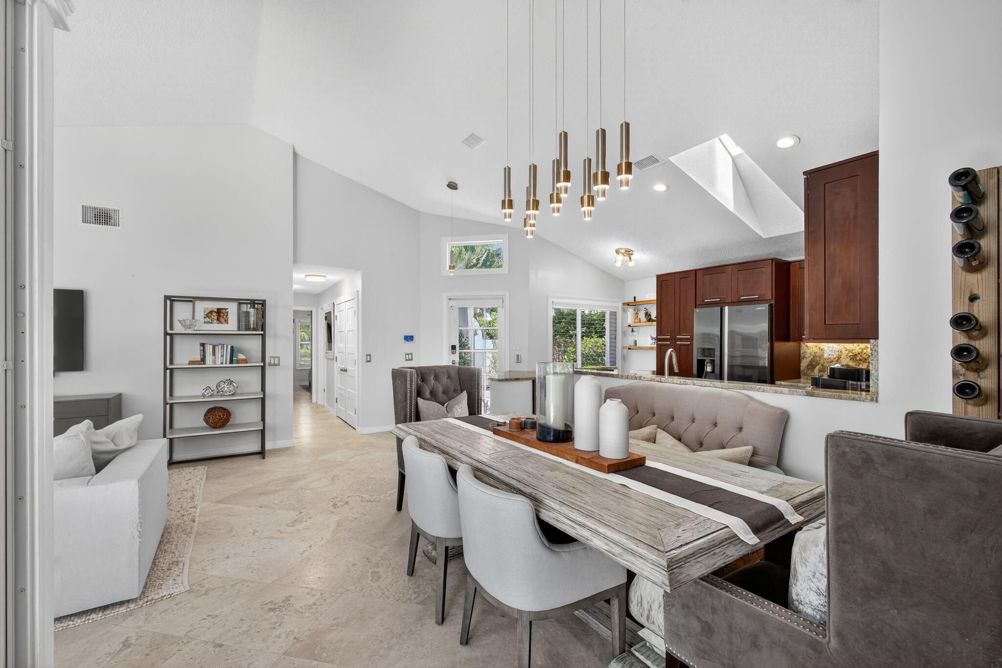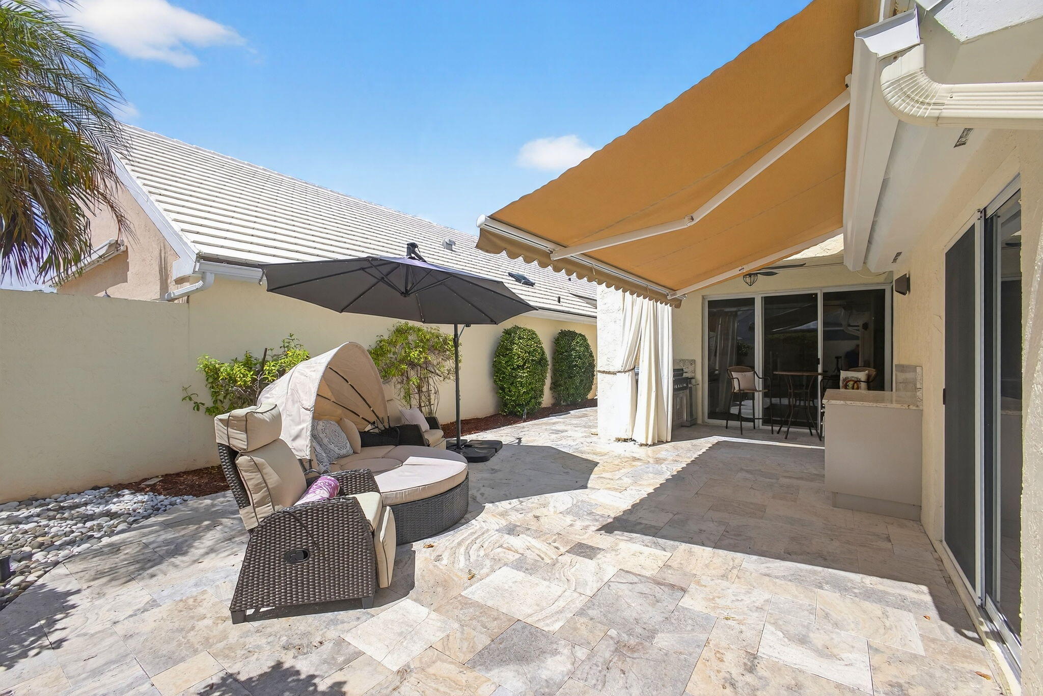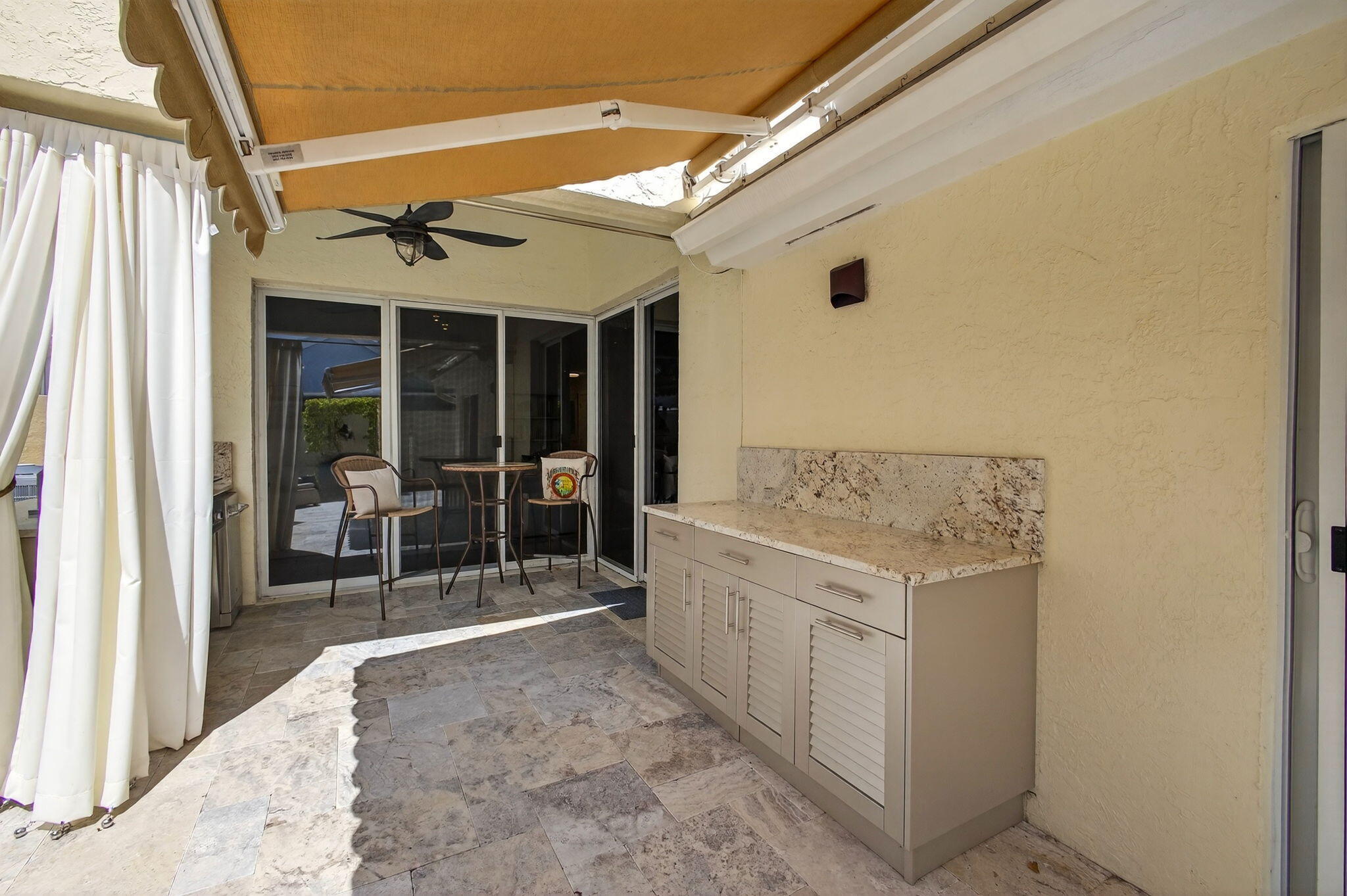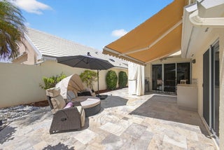 Discover this charming 3BR/2BA single-story residence on a desirable corner lot in exclusive Barclay Club. Soaring vaulted ceilings and elegant diagonal travertine flooring create seamless flow from the open living areas through floor-to-ceiling sliders to the expansive rear patio. The fully renovated designer kitchen showcases custom wood cabinetry with LED lighting, striking Netuno Bordeaux granite counters, and premium black stainless Samsung appliances including induction range, counter-depth refrigerator, and digital dishwasher. Exceptional outdoor entertaining awaits with a spacious patio featuring summer kitchen and retractable awning--perfect for year-round Florida living. Recent major improvements include impact windows and doors installed in 2019, a new HVAC system from 2020,and a Bradford-White 80-gallon water heater with circulation pump added in 2021, motorized blinds, new light fixtures in the living, dining and kitchen, interior paint and floating shelves. Located minutes from PGA National's championship golf, resort dining, and community pool access. This rare combination of designer finishes, modern upgrades, and prestigious location offers the ultimate Palm Beach Gardens lifestyle. Perfect for those seeking luxury, comfort, and world-class amenities in one of the area's most sought-after communities.