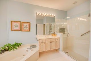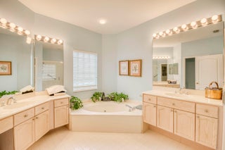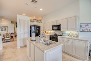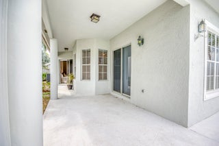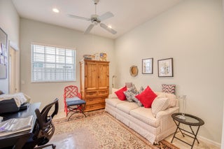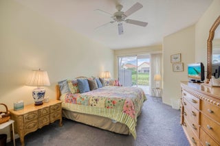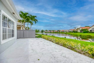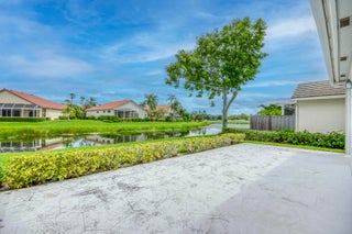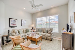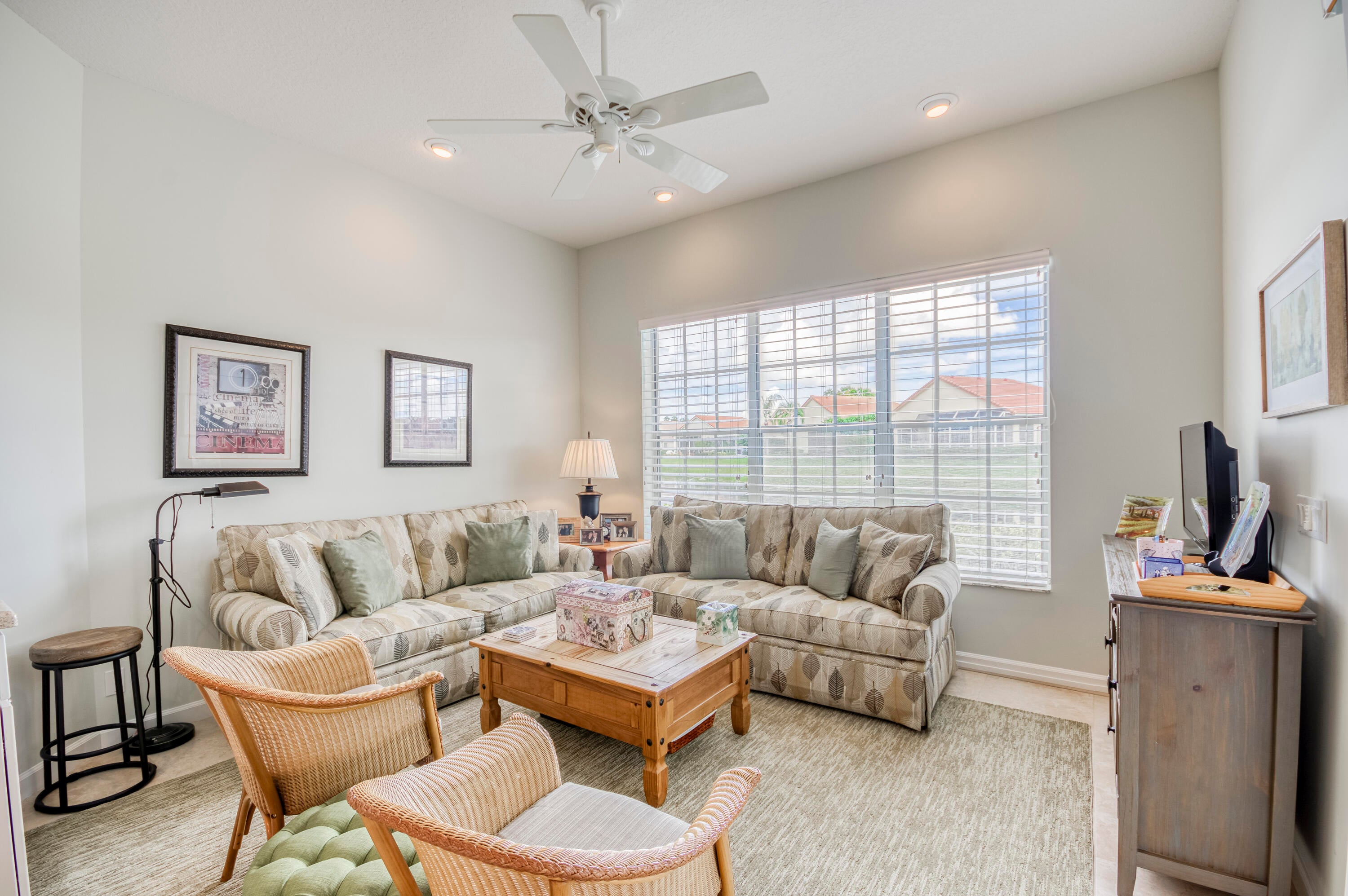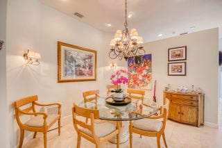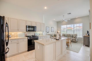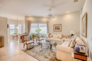 Welcome to this 2,023 sq ft CBS single-family home, featuring 3 bedrooms and 3 bathrooms in the prestigious Masters at Eagleton neighborhood of PGA National. The bright living room is filled with natural light from sliding glass doors and recessed ceiling lighting, complemented by off-white walls and neutral stone-look tile. Adjacent, the formal dining area offers a chandelier, wall sconces, and recessed lighting, seamlessly connecting to the open-concept living space. The kitchen boasts linen-toned paneled cabinets, granite countertops, a neutral mosaic glass tile backsplash, black appliances, a prep island with sink and dishwasher, and a sunny breakfast nook in a bay window. The cozy family room overlooks tranquil lake views and provides access to the covered patio. A spacious officewith en-suite bath offers flexibility as a guest suite. The primary suite features a seating area, walk-in closet, and private en-suite with dual vanities, Roman tub, glass-enclosed shower, and water closet. The guest bedroom is bright and comfortable, offering generous closet space and perfect for welcoming visitors. Outdoor living is enhanced by a covered side patio off the living and family rooms and an open back patio off the primary bedroom, perfect for relaxing or entertaining while enjoying serene lake views.