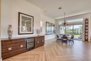 This Lewiston Expanded model offers 2,790 square feet of thoughtfully designed living space on a 7,679-square-foot lot with tranquil preserve views and of the golf course at a distance, creating a serene backdrop for everyday living. Appointed with a whole-house generator and water system, phantom screens, and an EV charging outlet, it effortlessly blends modern convenience with refined luxury. Inside, the home is beautifully finished in a soft linen-inspired palette, with smooth ceilings and walls and elegant ceramic wood-look tile set in a herringbone pattern throughout. Sunlight fills the open-concept living area through expansive windows, highlighting theseamless flow from the bright and inviting expanded great room into the chef's kitchen and dining area. The kitchen is a masterpiece of style and function, featuring sleek white glossy cabinetry, quartz countertops and backsplash, top-of-the-line stainless steel appliances, and a gas cooktop. At its heart, an expansive island with a slate-toned countertop provides additional seating and a striking visual contrast, perfect for both casual meals and entertaining. The adjacent dining area is anchored by a striking modern light fixture and an expansive sliding glass door that opens to the covered patio, flooding the space with natural light. Just off the entrance, the library features custom built-in shelving and offers a tranquil retreat for reading or quiet reflection while framing views of the front garden. A flexible guest room, currently used as an office, includes a walk-in closet and provides ample space for work, study, or overnight guests. The primary suite is a luxurious retreat, with soaring architectural ceilings, neutral-toned carpeting, and space for a cozy seating area. Two generous walk-in closets and an upscale en-suite bathroom complete the suite, the latter blending classic and contemporary styles with dramatic dark wallpaper and marble-look tile. Dual sinks, a glass-enclosed shower with a seating bench, and a separate soaking tub create a space of both elegance and indulgent comfort. Step outside to the covered patio, surrounded by lush tropical landscaping and a fenced yard, offering an inviting space for outdoor relaxation and entertaining. All closets, including the laundry room, are built out with custom systems, while the garage features custom storage and epoxy flooring, combining function with style. This home is a seamless combination of refined design, modern amenities, and effortless indoor-outdoor living, offering a lifestyle of comfort, elegance, and sophistication in one of Palm Beach Gardens' most sought-after communities.