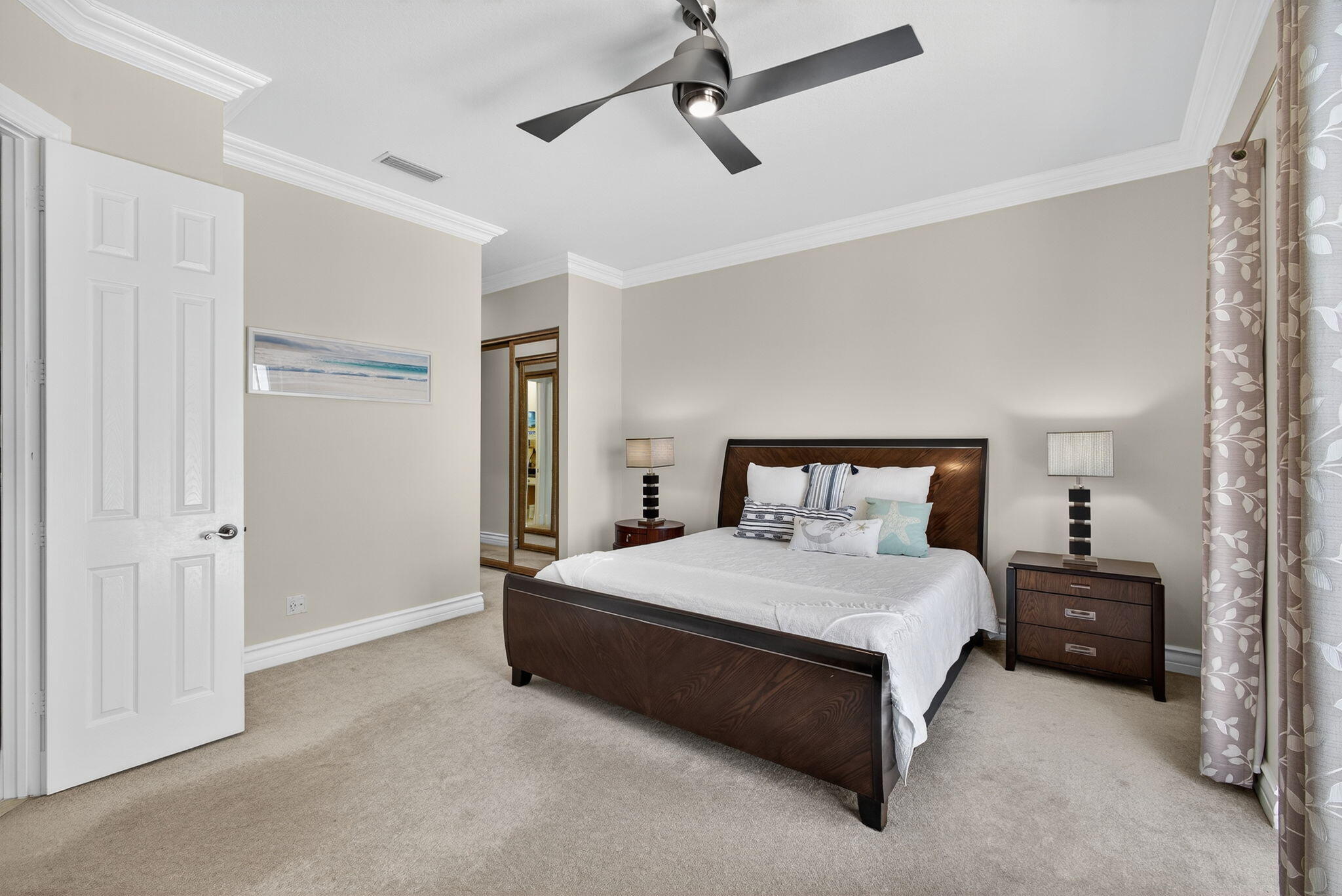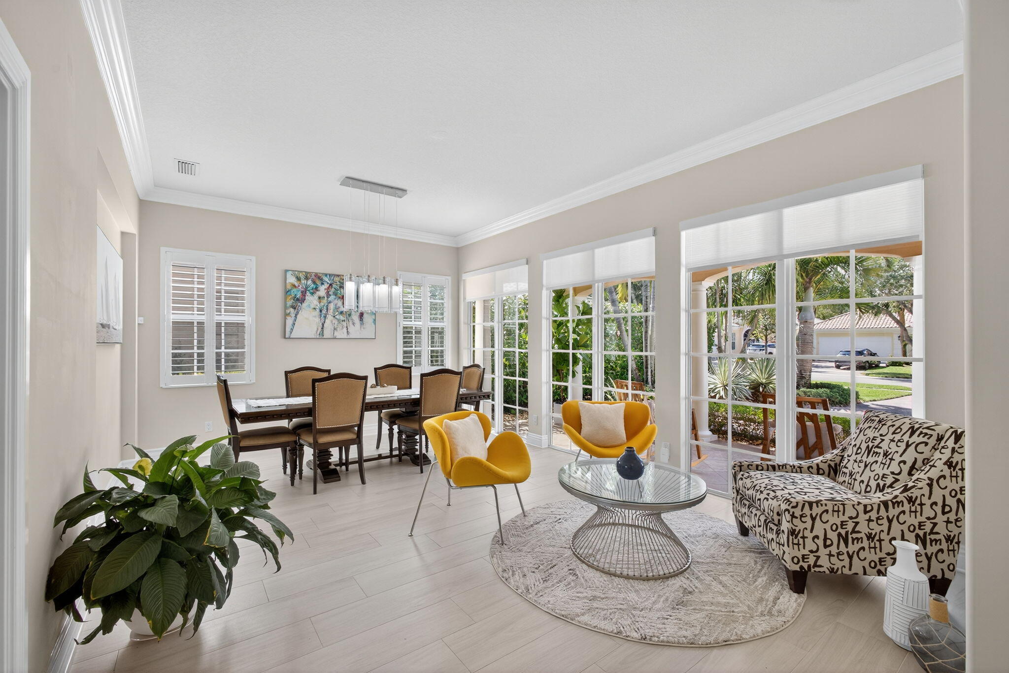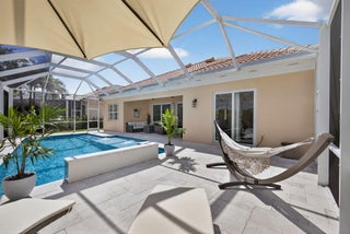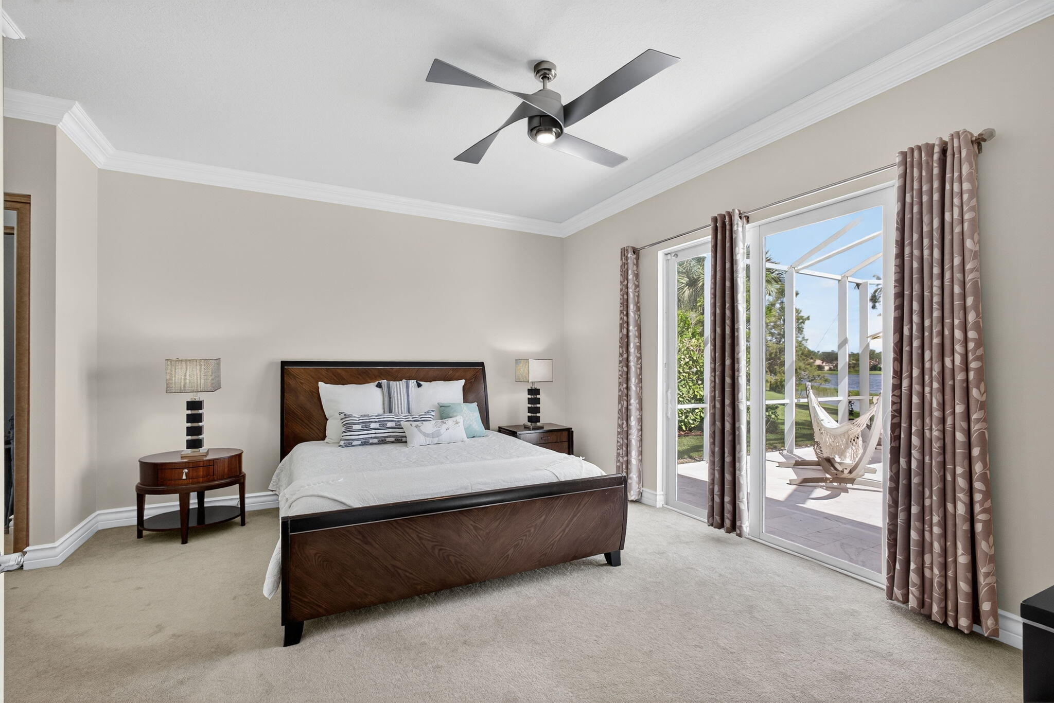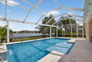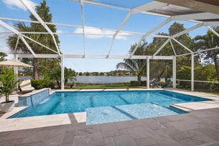 Enjoy the spectacular long lake and pool view located on a premium professionally landscaped lot in Palm Beach Gardens in the the Carlton Oaks community. The open SS & Granite Kitchen, Breakfast area and Family Room provide access to a newer 2021 30'+ pool with built-in sun shelve, surrounded by a picture window screen room and white marble decking/lanai. The interior of the home also features a living/dining, 4 bedrooms 3 baths plus a den with a built in murphy bed, and laundry room. Upgraded 7'' floor and crown moldings; 2024 new air conditioner; newly painted exterior and impact windows and doors; central vacuum, plantation shutters and 9' & 12'' ceilings. Schedule a showing appointment to see this exceptional property.