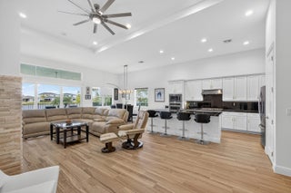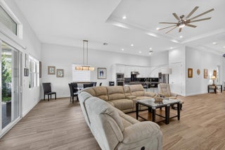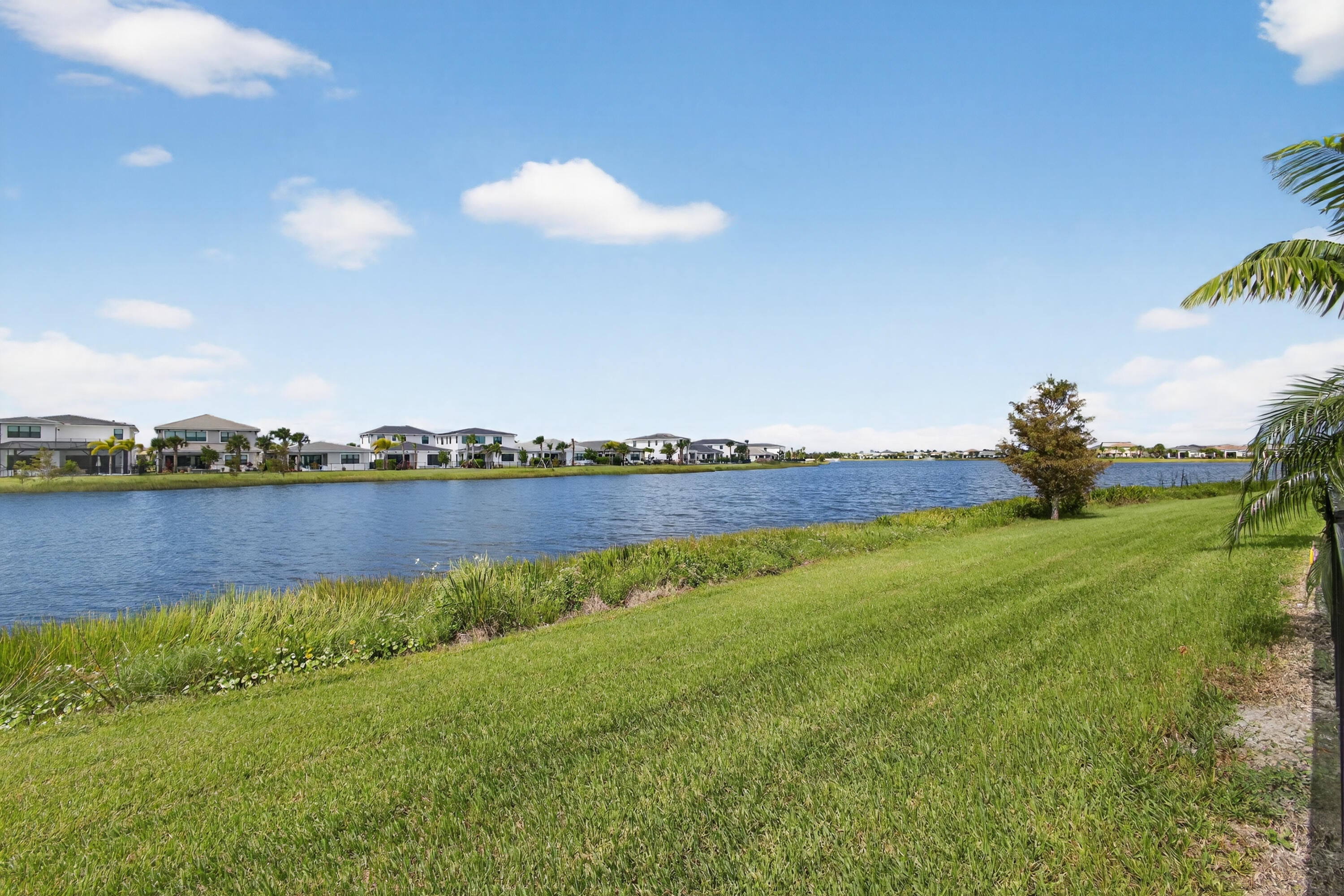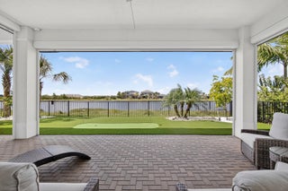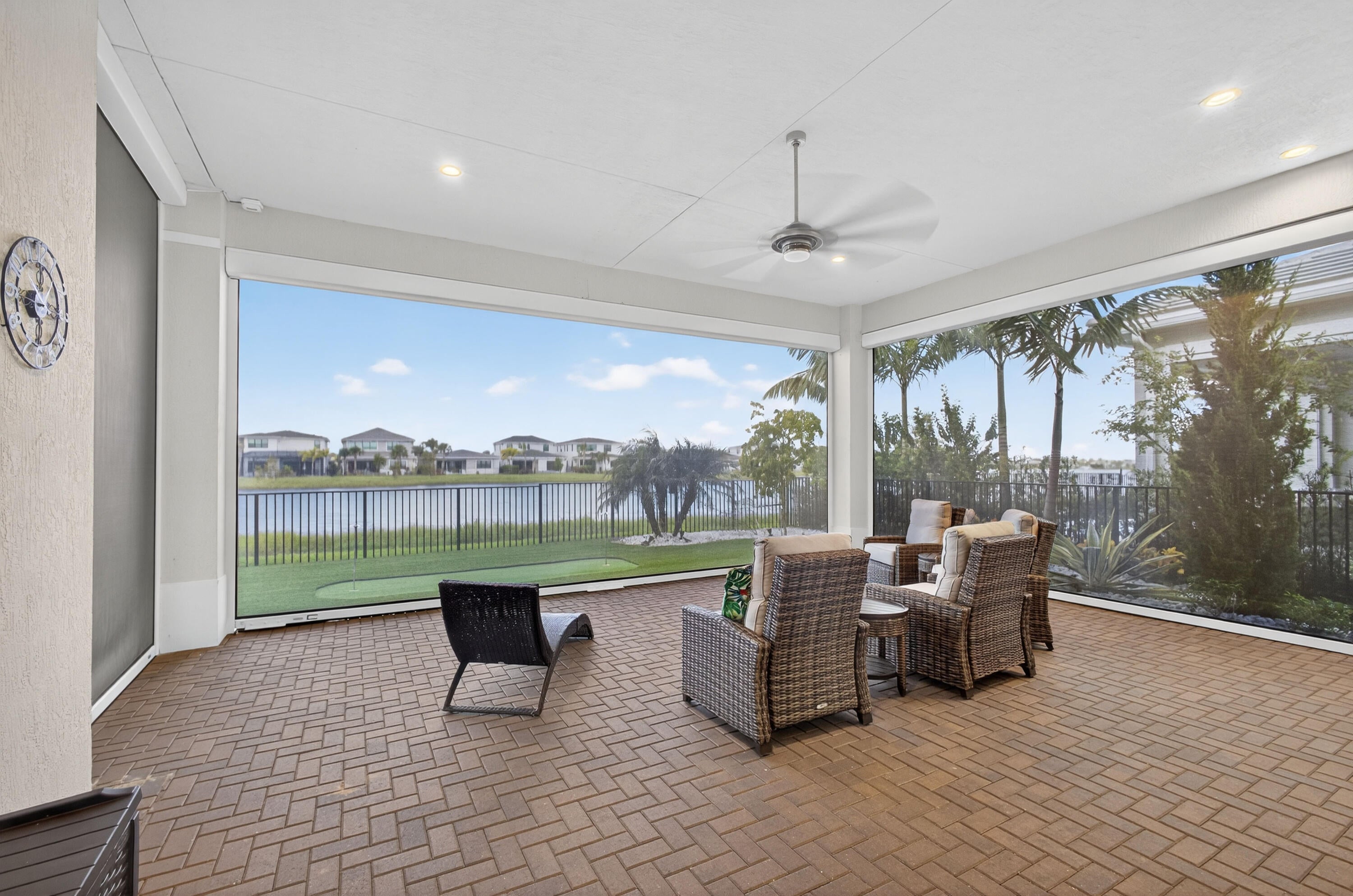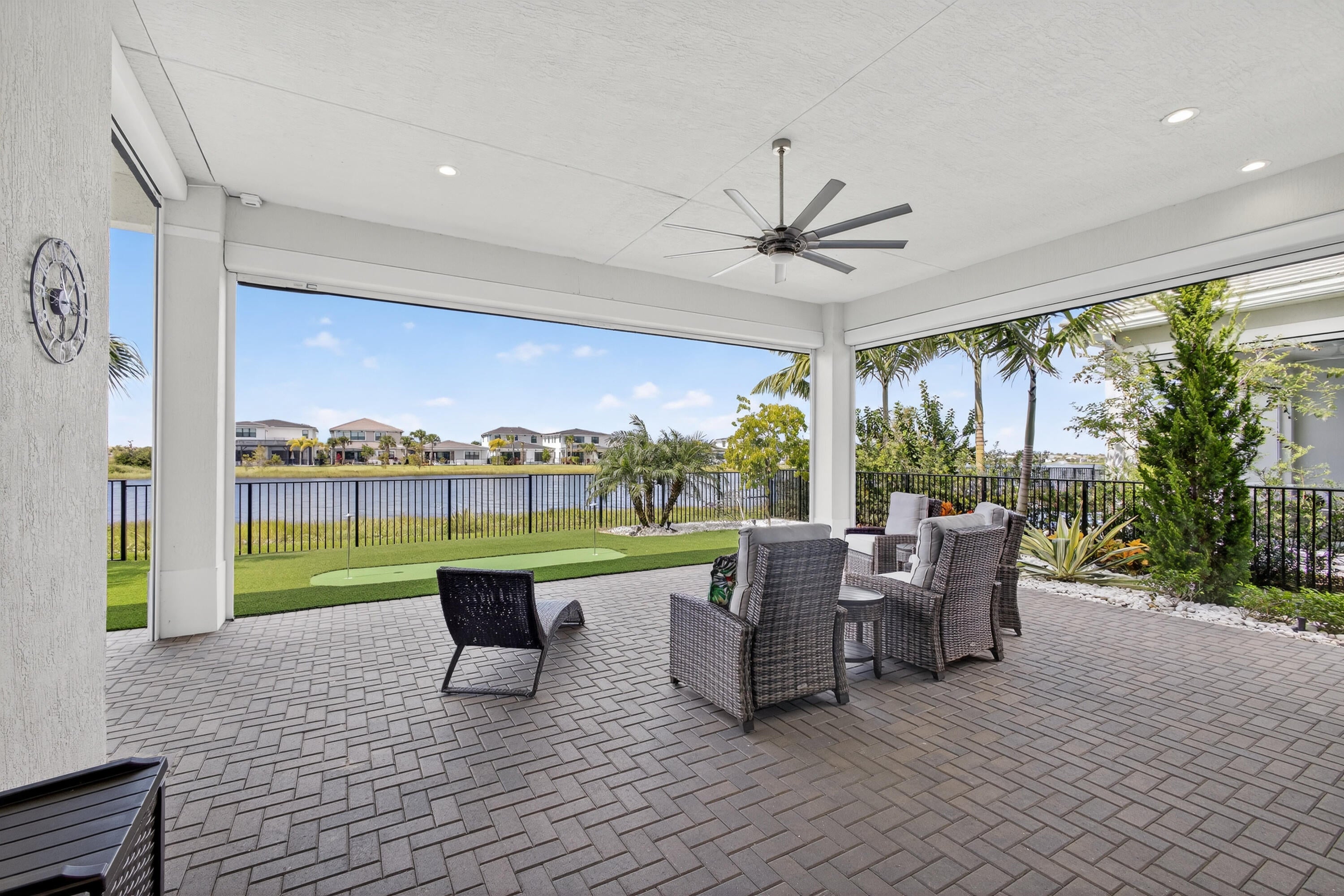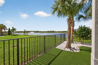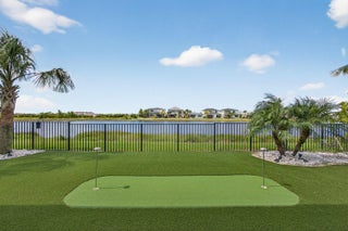 This beautifully appointed 3-bedroom plus office, 3-bath home offers an open and airy floor plan with a bright coastal feel and stunning wide water lake views. Western exposure provides magnificent sunsets that can be enjoyed from the extended lanai patio, creating the perfect setting for entertaining or relaxing by the water. The home features a Tropical-inspired backyard complete with astro turf, a golf putting area, and remote-controlled hurricane patio screens for year-round comfort. Inside, every detail has been thoughtfully upgraded, whole house, Generac Generator, oversized 8-blade ceiling fans with lights in the living areas, bedrooms, and patio, custom blinds on all windows, upgraded light fixtures, and an oversized jetted tub in the primary suite and comfort height toilets.