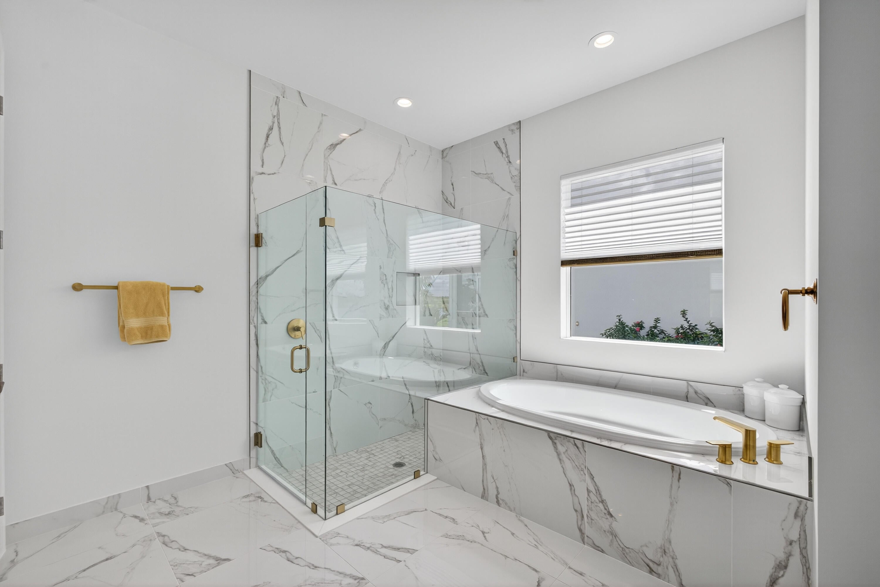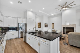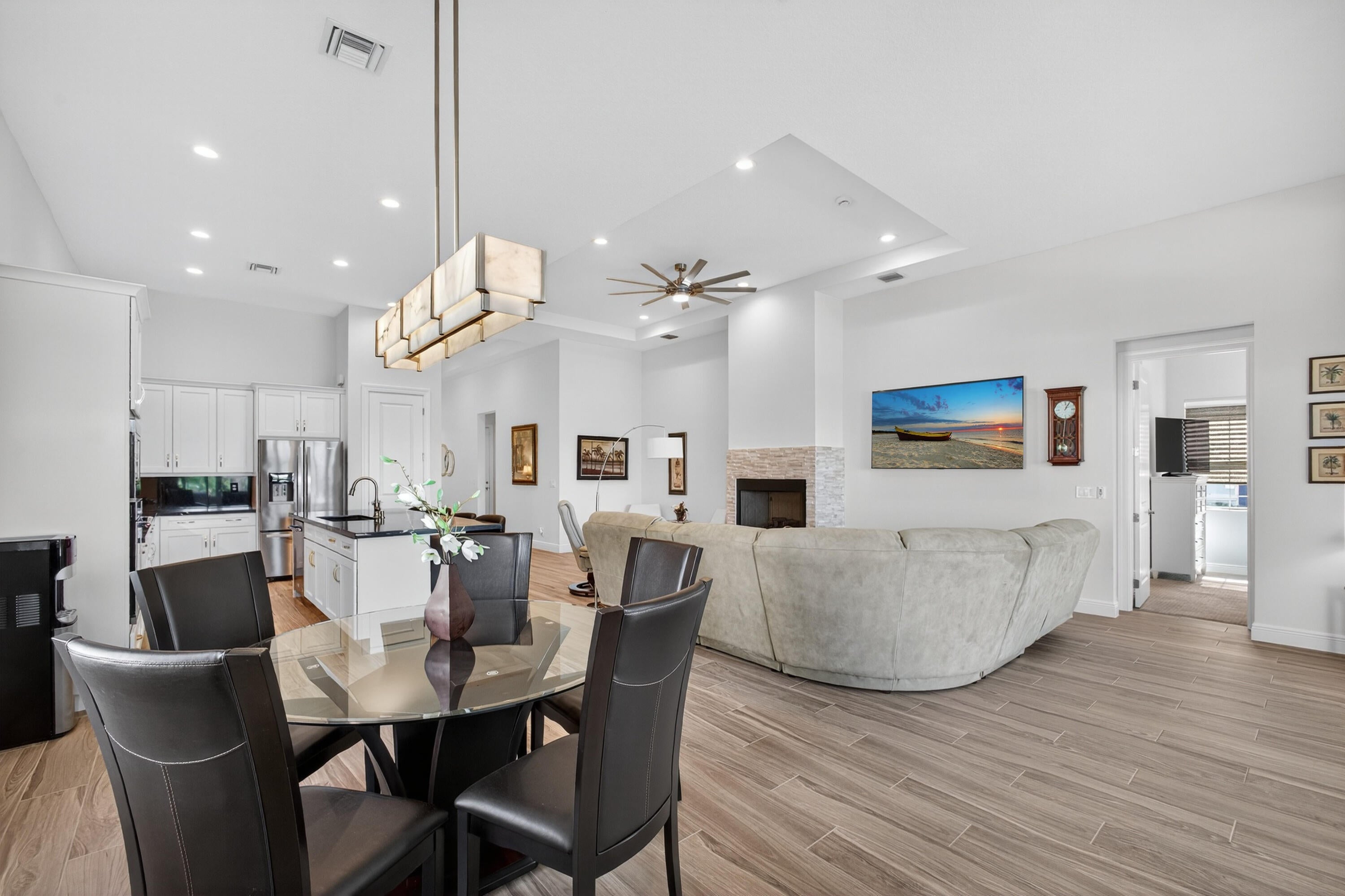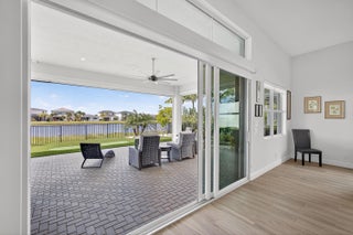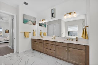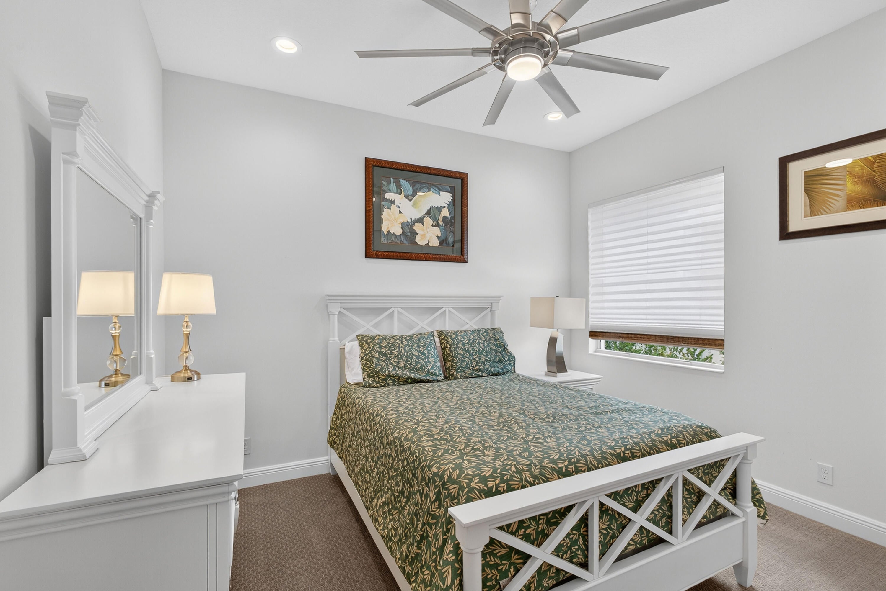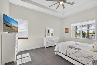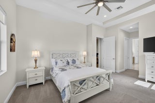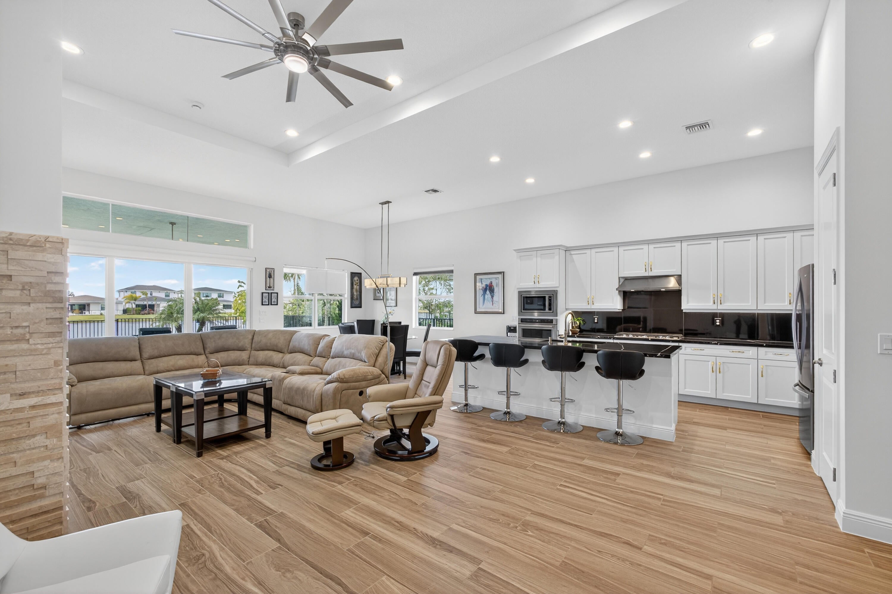 This beautifully appointed 3-bedroom plus office, 3-bath home offers an open and airy floor plan with a bright coastal feel and stunning wide water lake views. Western exposure provides magnificent sunsets that can be enjoyed from the extended lanai patio, creating the perfect setting for entertaining or relaxing by the water. The home features a Tropical-inspired backyard complete with astro turf, a golf putting area, and remote-controlled hurricane patio screens for year-round comfort. Inside, every detail has been thoughtfully upgraded, whole house, Generac Generator, oversized 8-blade ceiling fans with lights in the living areas, bedrooms, and patio, custom blinds on all windows, upgraded light fixtures, and an oversized jetted tub in the primary suite and comfort height toilets.