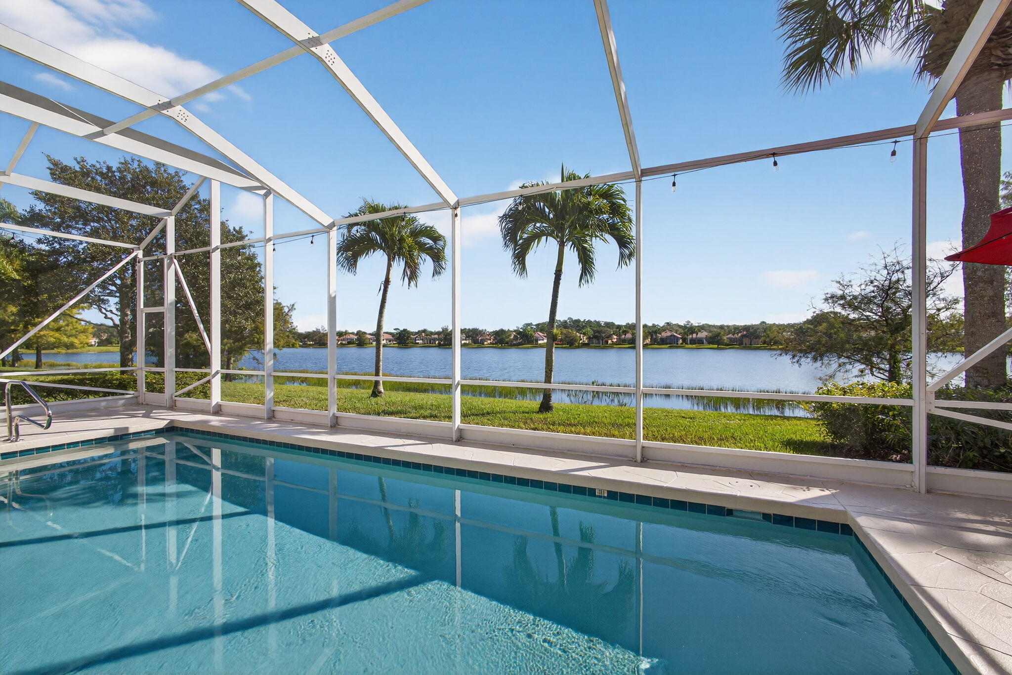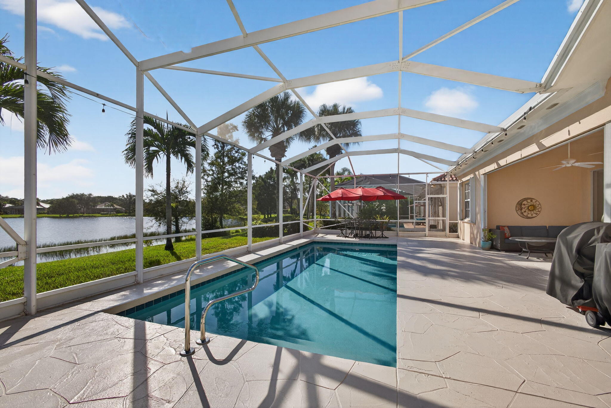 Don't miss this rarely available 4 Bedroom & 3 Bathroom home located in the highly sought after community of Carleton Oaks.Nestled along the water this newly updated home is a unique blend of style and sophistication. The open floor plan features porcelain floors, a New Gourmet Kitchen with High End SS Appliances, a Great Room highlighted by soaring Vaulted Ceilings that project an abundance of natural light and breathtaking lake views. The luxurious Primary Suite boasts En-Suite His/Her bathrooms and a spacious walk-in closet. The formal Living and Dining Rooms exude warmth, tasteful Crown Molding and soft welcoming tones. Venture out onto the expansive Screen Enclosed Patio complete with an inviting Solar Heated Pool that provides the perfect setting for both entertaining and relaxation
