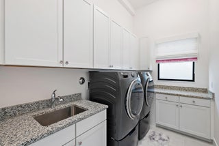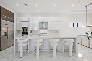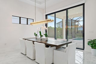 A sanctuary of balance and design, this one-level home spans over 3,000 SQ. FT. of living space with 3 bedrooms, 3.5 baths, and an oversized den or 4th bedroom. The grand foyer features 17-ft. ceilings, and 12 ft. throughout. Only one owner of this new construction home that closed in 2024. The kitchen's statement island anchors the space and the kitchen features a full quartz backsplash, acrylic touch-latch cabinetry, and GE Monogram appliances complemented by Restoration Hardware lighting. The serene primary suite features wood floors, a floating double vanity, soaking tub, walk-in shower, and views of the saltwater pool. California Closets and roller shades in all rooms; automatic shades in the master, great room and den. Outdoors, relax on the travertine patio with screen enclosure