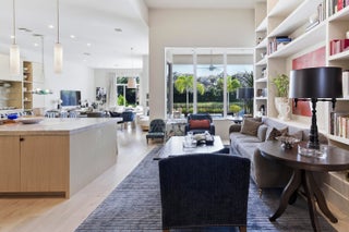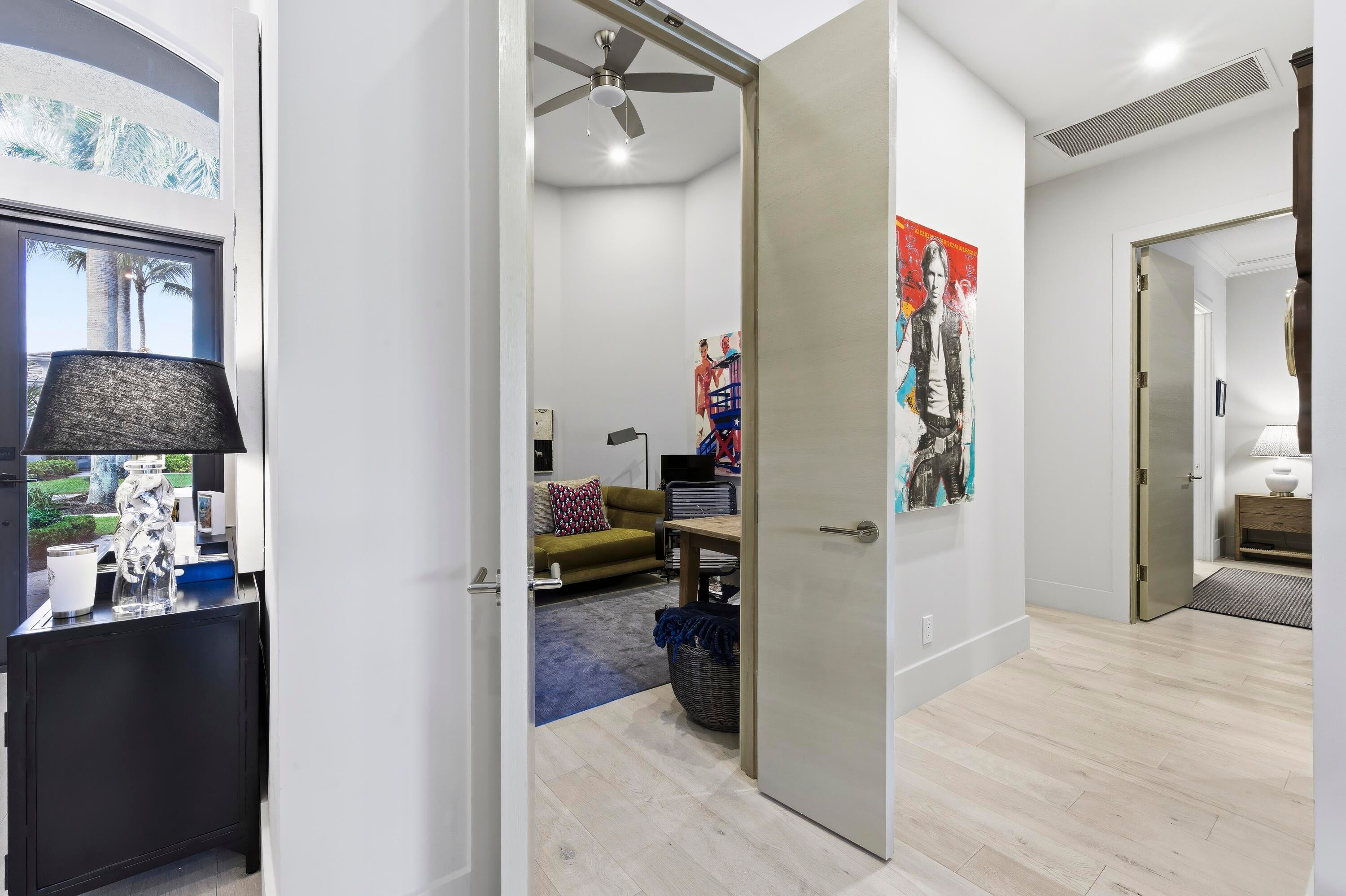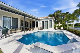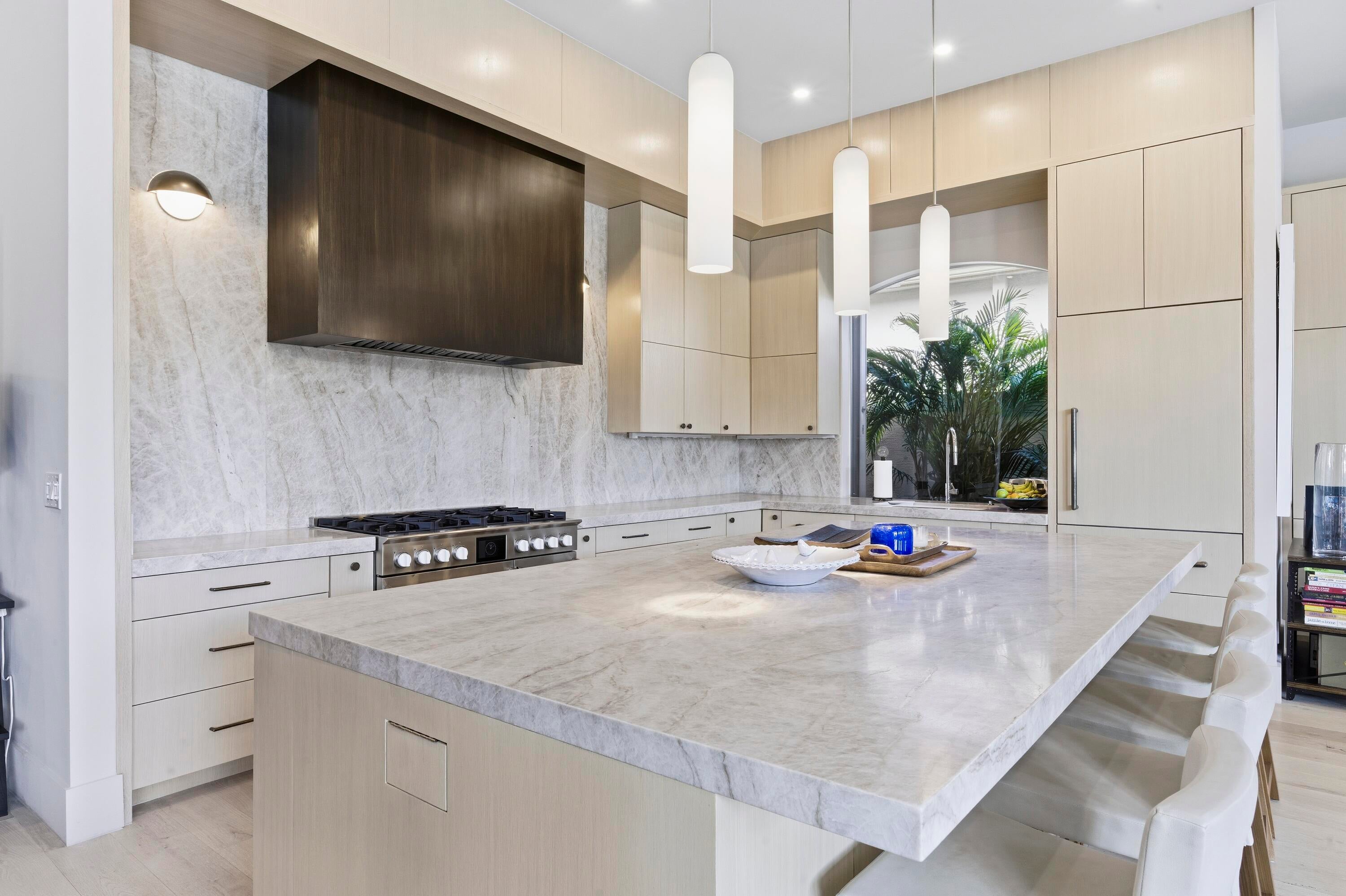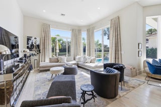 Welcome to sophisticated single-level living at its finest. This meticulously reimagined residence showcases over 1 million dollars in top designer renovations, that blend contemporary elegance with timeless luxury. Rich white oak flooring complemented by matching white oak doors. The kitchen has a show stopping chef's kitchen featuring an oversized Taj Mahal quartzite island, white oak cabinetry with loads of storage and pull out drawers. Premium appliances include 48'' Blue Star range, Sub-zero refrigerator, and Miele dishwasher. adjacent dining area with white oak bar, Taj Mahal counters and Zellige handmade tile backsplash with Sub-zero beverage and wine refrigerators. Custom closets in all suites, bathrooms in all suites. Impact windows and doors, new pool deck, retractable screens,overlooks a tranquil lake and pool with a waterfall and zellige handmade tile with new landscape lighting around the backyard. do not miss this one!
