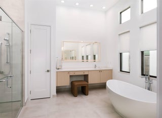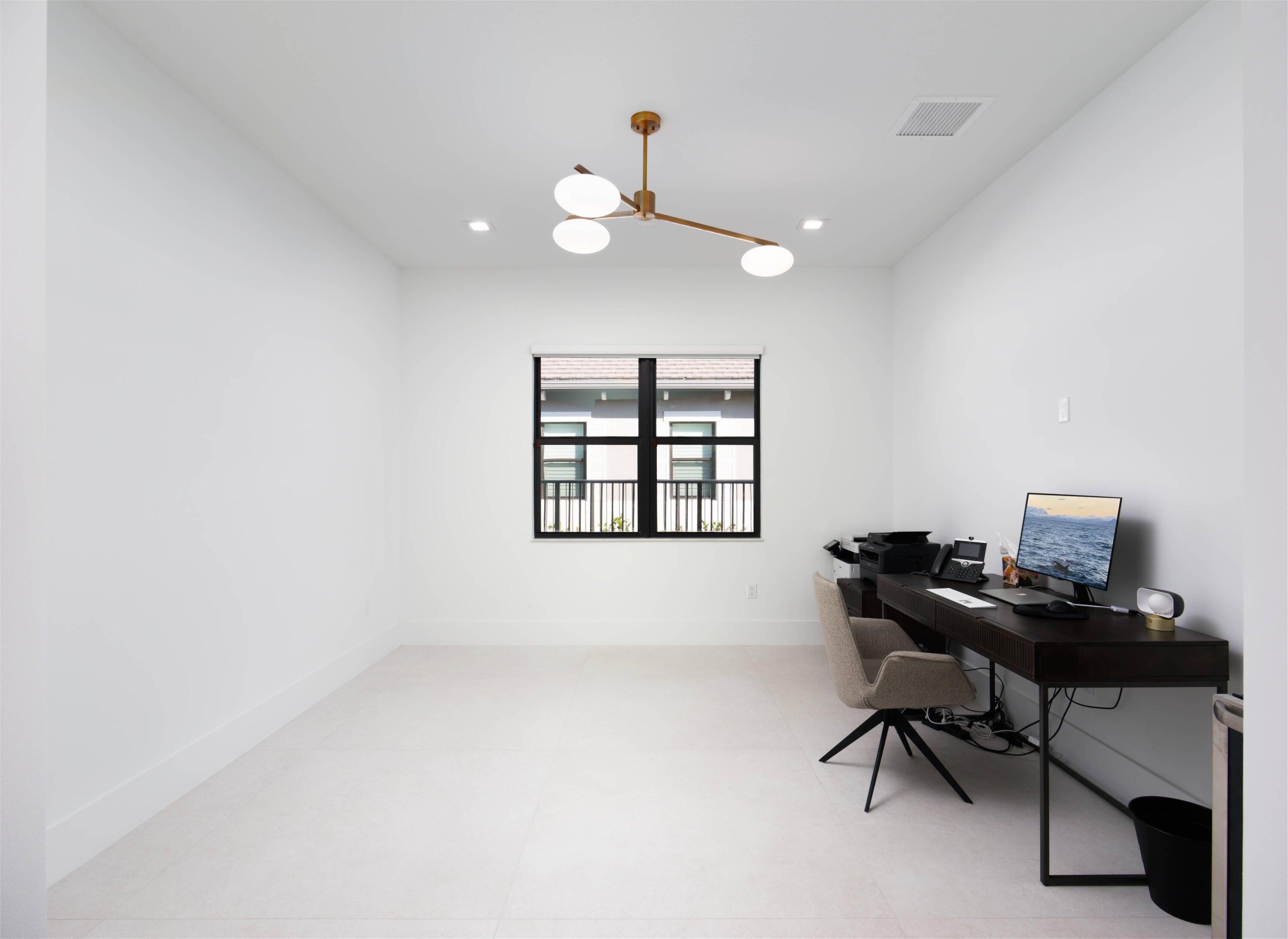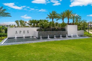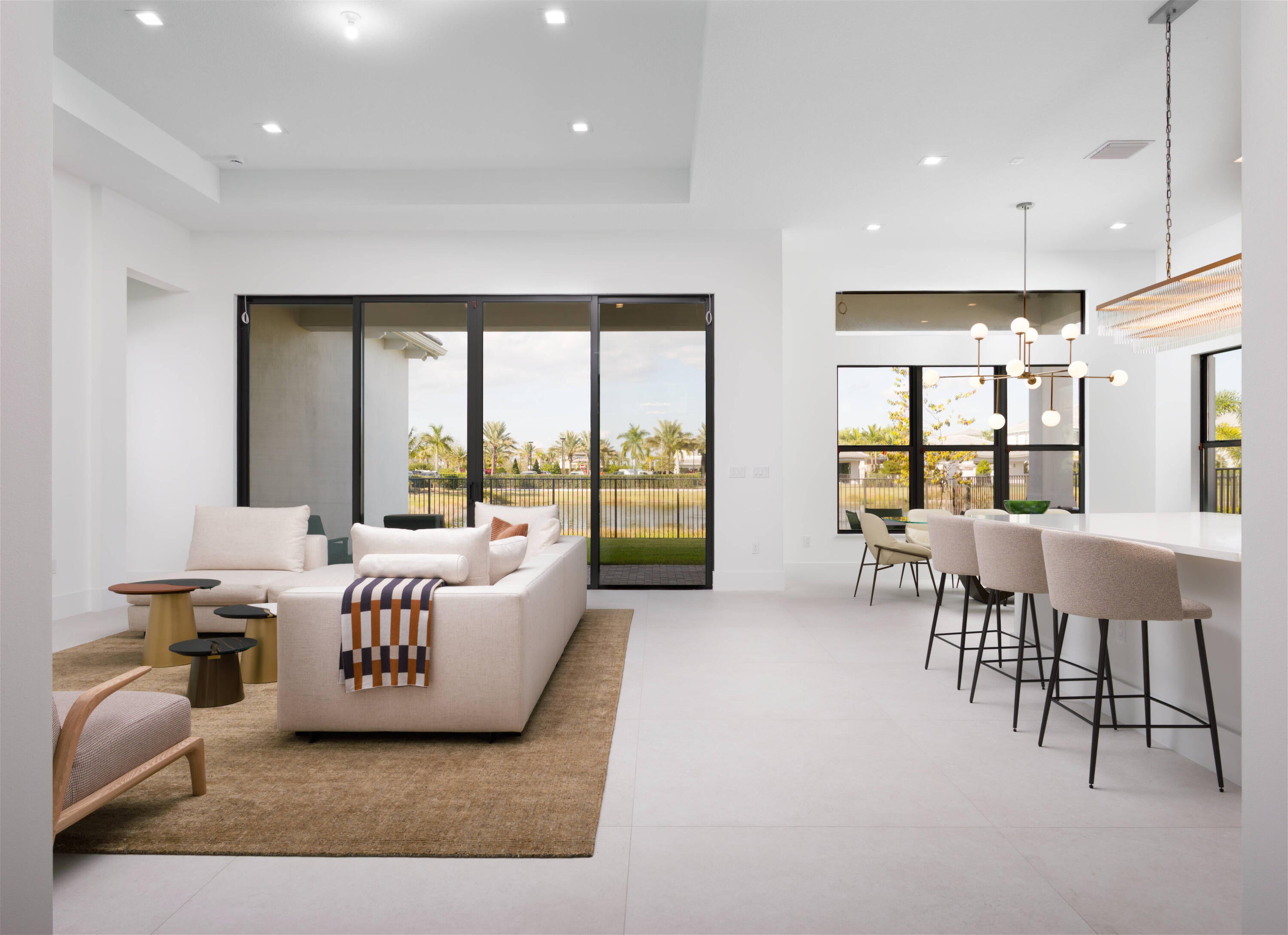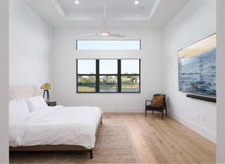 Experience refined contemporary living in this newly built 2024 single-story residence located in the prestigious Apex at Avenir. With 3,248 square feet of thoughtfully designed living space on an 8,085-square-foot lakefront lot, this 4-bedroom, 4.5-bath home with an office and a 3-car garage delivers a perfect blend of luxury, comfort, and modern elegance. Through elegant French doors, the foyer welcomes you with soaring ceilings and a breathtaking chandelier that instantly sets a tone of sophistication. Large-format stone-look porcelain tile, an alabaster-toned color palette, and custom high-end lighting thoughtfully placed throughout create a bright, cohesive environment that balances elegance with clean, contemporary warmth. The expansive great room is ideal for both relaxation andentertainment, featuring a recessed ceiling, a media-ready wall, and double sliding doors that open to the covered patio. The adjacent gourmet kitchen showcases modern white oak cabinetry, crisp white quartz countertops and backsplashes, an impressive island with extra storage and seating, and a full suite of stainless steel appliances including a gas range. The elegant dining room, framed by large windows, offers peaceful views of the side garden and the shimmering lake and fountain. A dedicated office provides a spacious and quiet retreat for work or study. The primary suite is a true sanctuary, appointed with warm wood flooring, a recessed ceiling, and serene lake views. It includes room for a sitting area, dual walk-in closets, and a luxurious spa-inspired bathroom featuring dual vanities (one with a make-up/dressing station), a grand soaking tub, and an expansive glass-enclosed rain shower with floor-to-ceiling tile and a built-in bench. Three additional guest suites offer warm wood flooring, walk-in closets, and private en-suite bathrooms, each serving as a blank canvas for individual style. Outdoor living is effortless with a covered patio designed for entertaining, with distinct seating and dining areas and views of the manicured, fully fenced backyard. With plenty of room for a future pool and spa, the property backs to a tranquil lake and fountain for stunning daily scenery. Additional features include full impact windows, a spacious interior laundry room with abundant storage, a utility sink, and high-efficiency appliances. This is modern Florida luxury at its finest, stylish, expansive, and designed for elevated living.