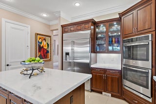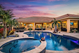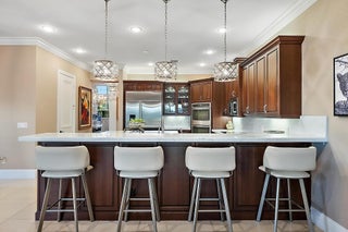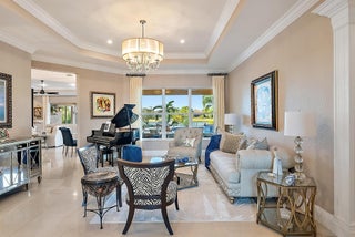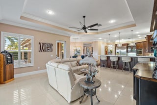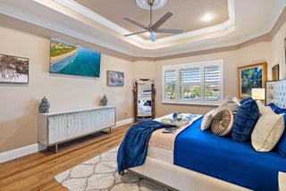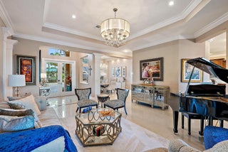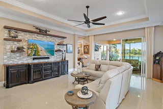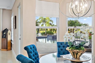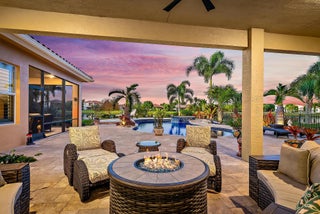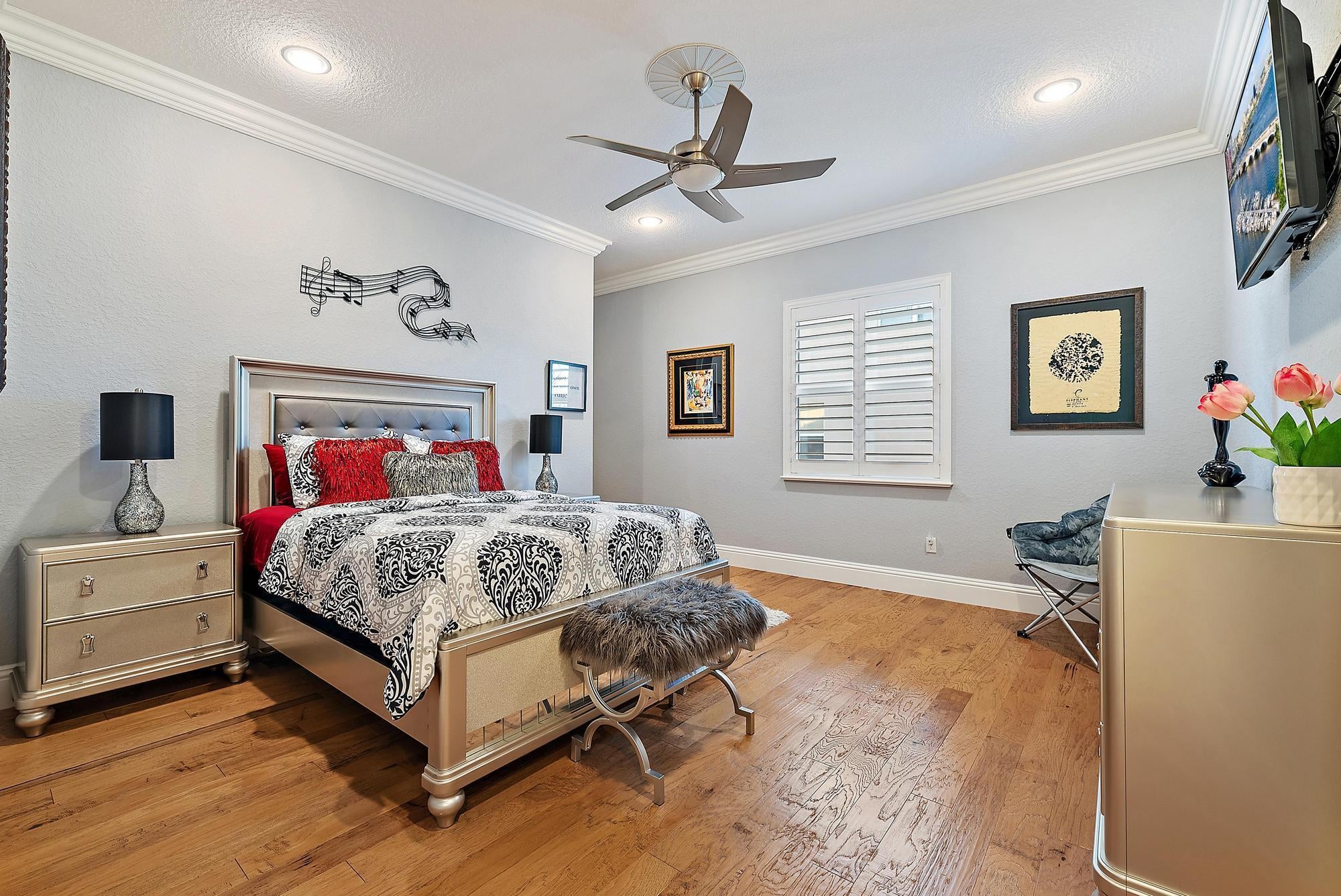 Your own private oasis located on an exceptional, one-of-a-kind lot. Perfectly positioned within a quiet cul-de-sac in the Preserve at Bay Hill Estates, this GL Homes-built residence offers a rare oversized 100 x 200 foot homesite with approximately 100 feet of water frontage, creating a sense of privacy and scale that is increasingly difficult to find. The circular drive and full three-car garage provide both curb appeal and everyday functionality, while the home itself spans over 4,000 square feet on a single level. The desirable Cypress Grande floor plan features 4BR/4.5BA + Office + Media Room, all thoughtfully arranged for comfortable living and entertaining. Impact glass is found throughout the home.Interior improvements completed post-build include hardwood flooring throughout all bedrooms and the billiard room, custom closets in every bedroom and the pantry, and extensive built-ins highlighted by a granite-topped office workspace. Plantation shutters and custom drapery add continuity and finish throughout the home, complemented by crown molding and oversized baseboards. Practical upgrades include slide-out drawer systems in all bathroom and kitchen under-sink cabinetry, as well as a main air conditioning system replaced approximately two years ago with increased tonnage for enhanced efficiency and comfort. The kitchen has been updated with quartzite countertops installed in 2024, along with a Bosch dishwasher, LG induction cooktop, and new stainless steel sink, faucet, and disposal. Additional interior enhancements include hurricane-rated impact glass front doors, decorative woodwork pillars in the dining room and hallway, a slate stone feature wall with custom shelving in the great room, and a private sauna located within the men's primary bedroom closet. Outdoor living is equally well executed, anchored by a custom pool with integrated jacuzzi, auto-fill, and auto-drain features. A fully equipped outdoor kitchen with granite countertops comfortably seats eight and includes stainless steel cabinetry, sink, Twin Eagles grill, refrigerator, and icemaker. Travertine tile extends across the pool deck, lanai, and patio areas, while professionally designed landscaping surrounds the property with lighting throughout. Additional exterior features include a whole-house water filtration system with kitchen sink purifier and multiple outdoor ceiling fans servicing both the patio and screened lanai. The Preserve at Bay Hill offers residents access to tennis and pickleball courts, a basketball court, and a community park. Golf membership opportunities are available through PGA National but are not required. Bay Hill Estates is a gated community conveniently located near the heart of Palm Beach Gardens, with close proximity to its shopping and dining destinations. This offering combines a sought-after single-story floor plan, extensive improvements, and a premium waterfront cul-de-sac lot within one of Palm Beach Gardens' most established gated communities.