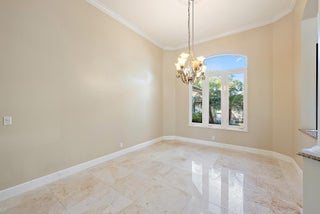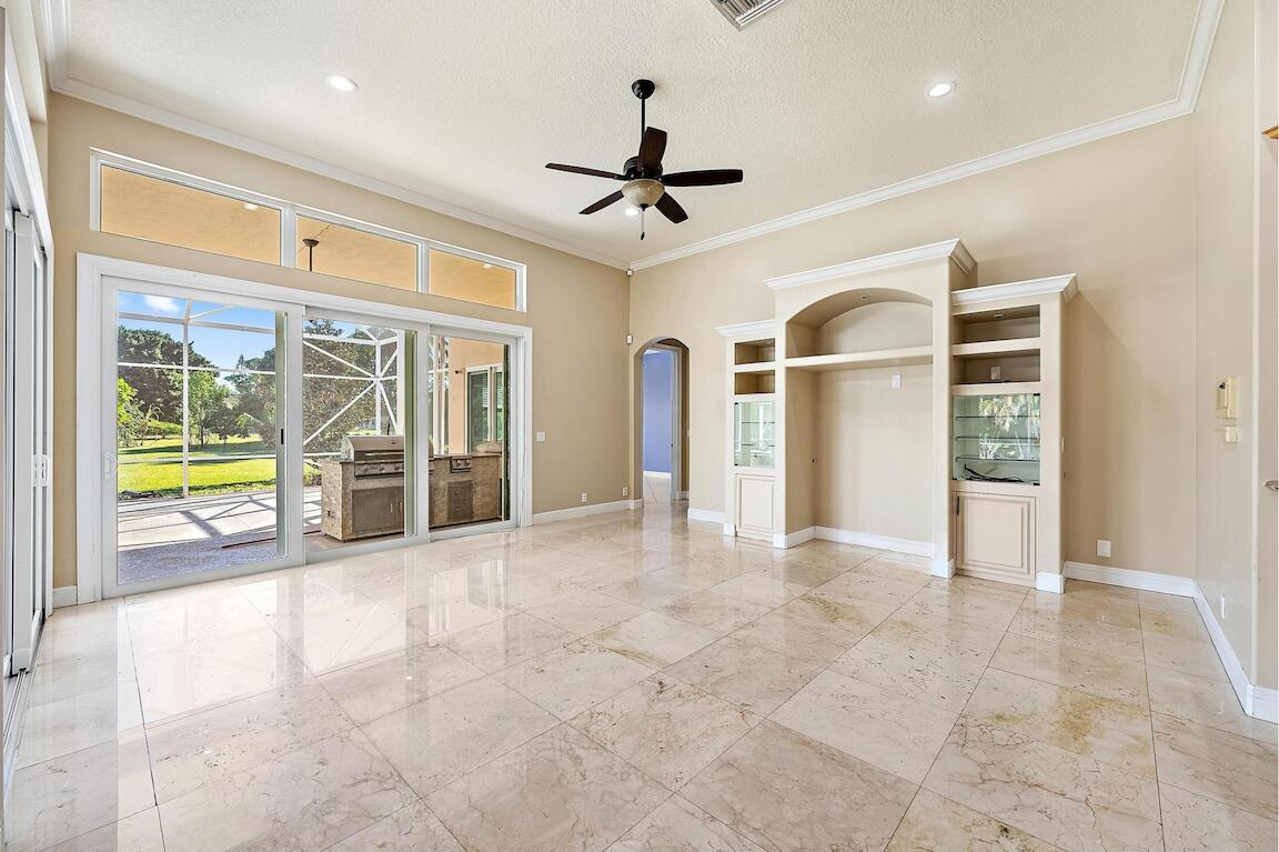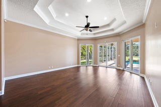 Set within the prestigious gated community of Steeplechase in the heart of Palm Beach Gardens, this beautifully designed custom one-story estate offers refined living on over an acre of land, complete with a circular driveway, tranquil interior waterway views, and a private resort-style backyard. Thoughtfully crafted for both everyday comfort and elegant entertaining, the home features five bedrooms, five bathrooms, a three-car garage, and a bonus room, all wrapped in timeless architectural detail.A grand double-door entry opens to a formal foyer highlighted by a coffered ceiling and marble inlay, setting the tone for the sophisticated interiors beyond.
