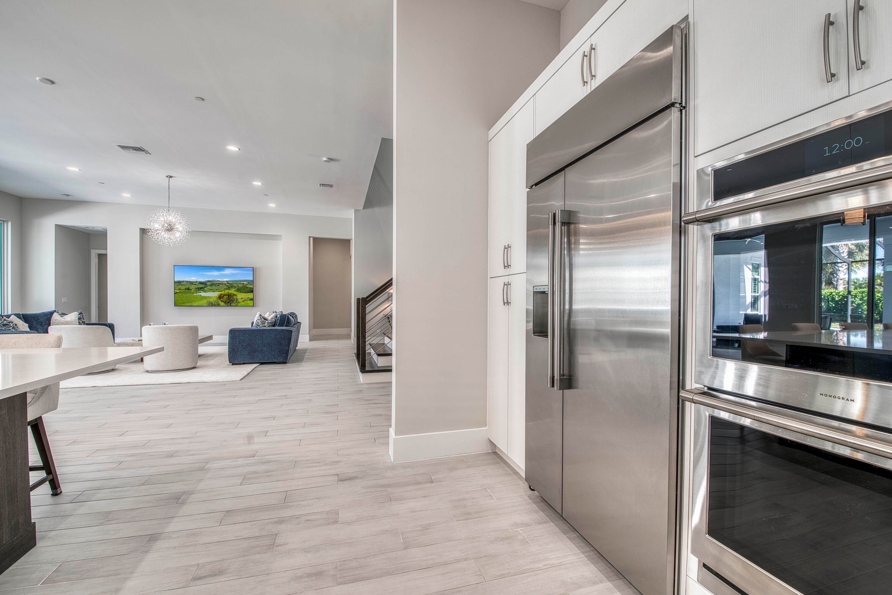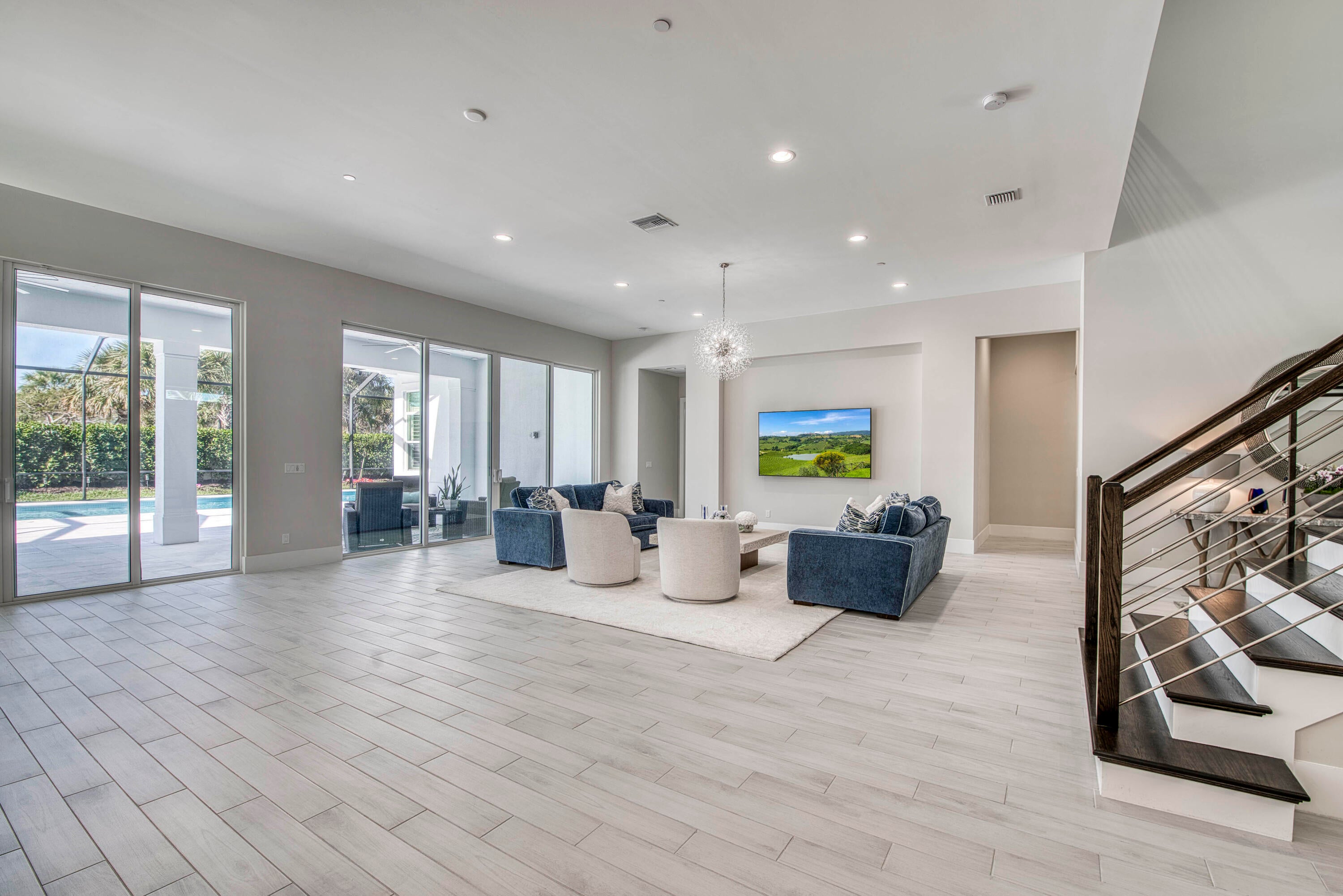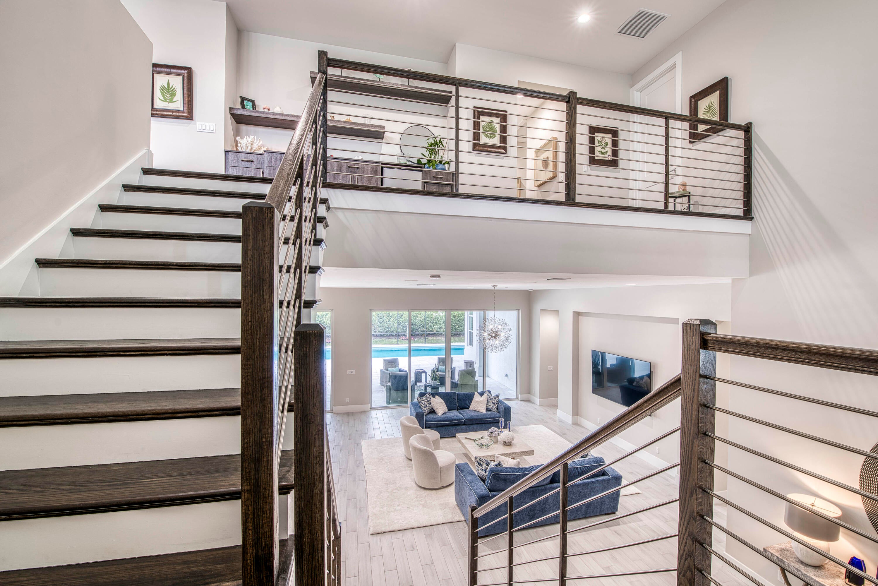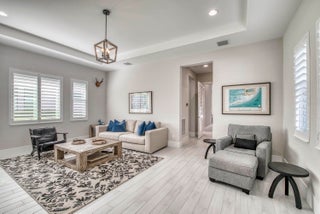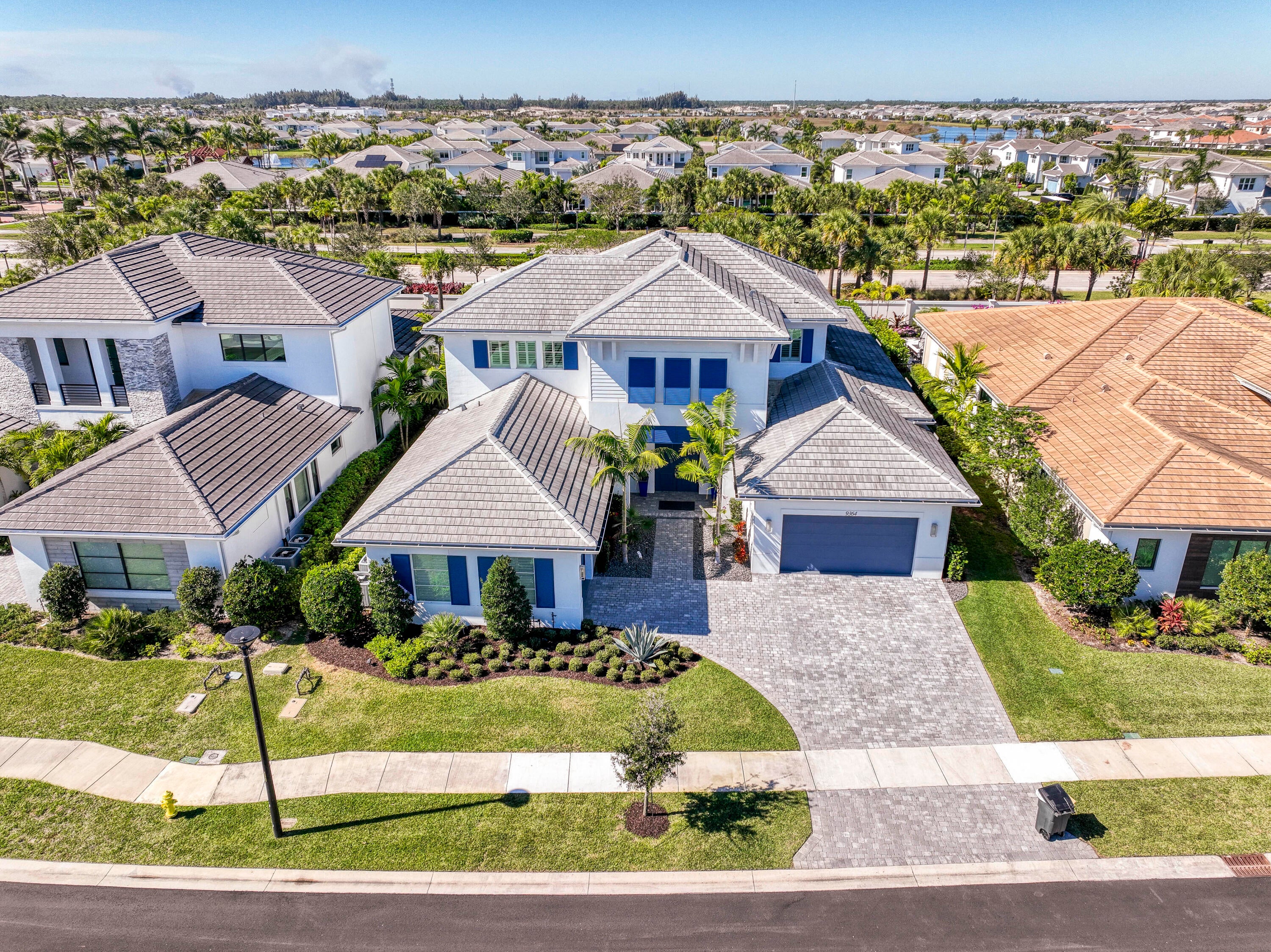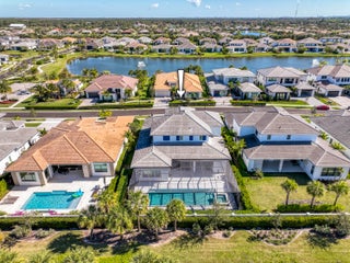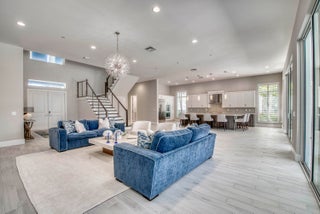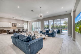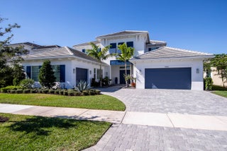 Welcome to this exceptional 2022-built Dominica floor plan residence offering 5 bedrooms, 6.5 bathrooms, 5,342 sq ft, and a 3-car garage, perfectly situated on an oversized 0.28-acre lot within walking distance to Avenir's resort-style clubhouse and amenity center. This immaculate, like-new home showcases high-quality finishes and thoughtful upgrades throughout, including full impact glass, an upgraded A/C system, a tankless water heater, white plantation shutters, custom closets, soaring ceilings, and expansive wall-to-wall sliding glass doors that seamlessly blend indoor and outdoor living. The open-concept design features a primary suite and guest suite on the main level, with three additional ensuite guest bedrooms upstairs, each offering walk-in closets and access to a shared loft