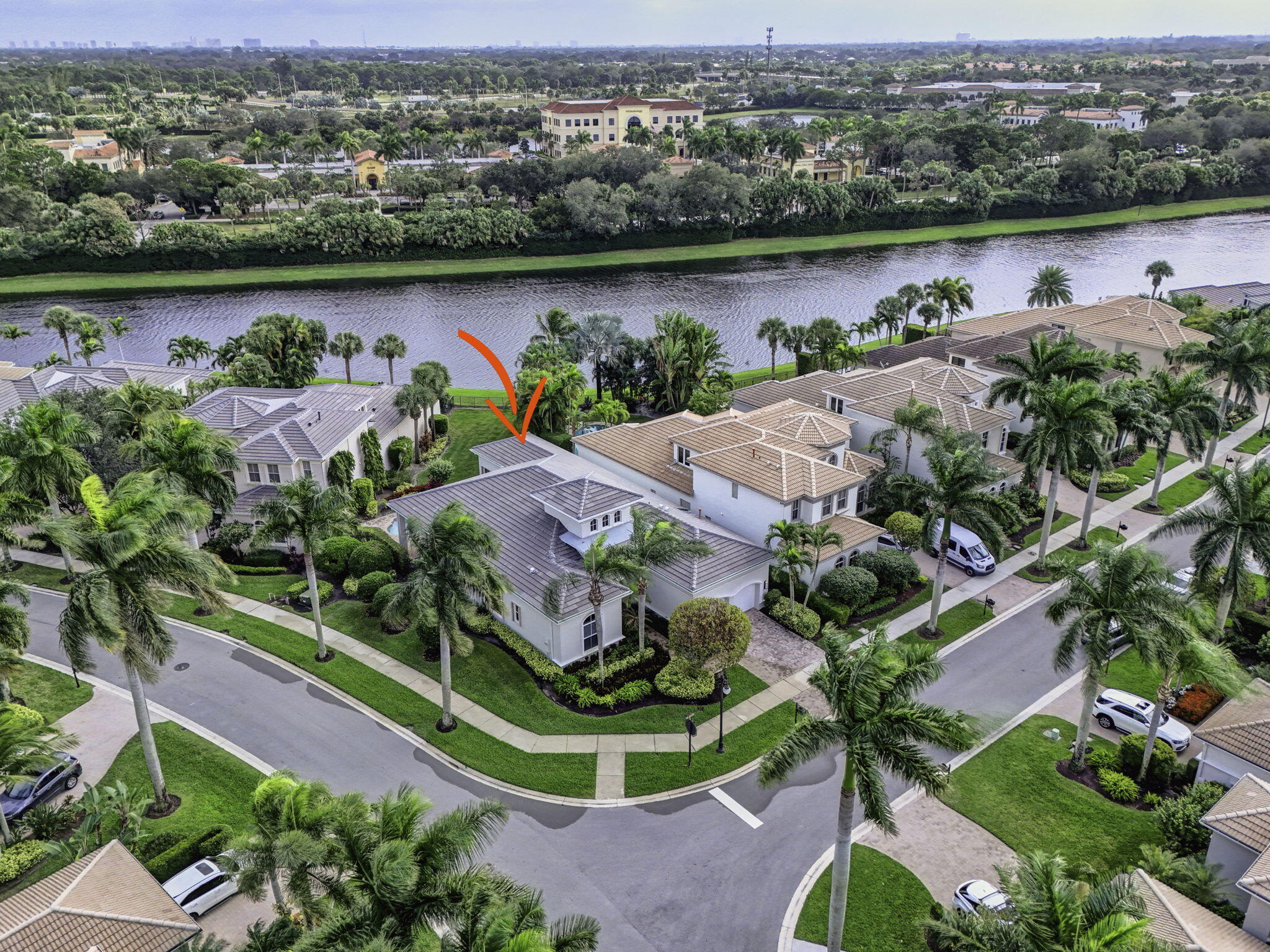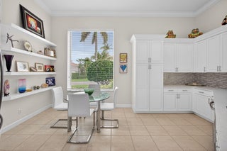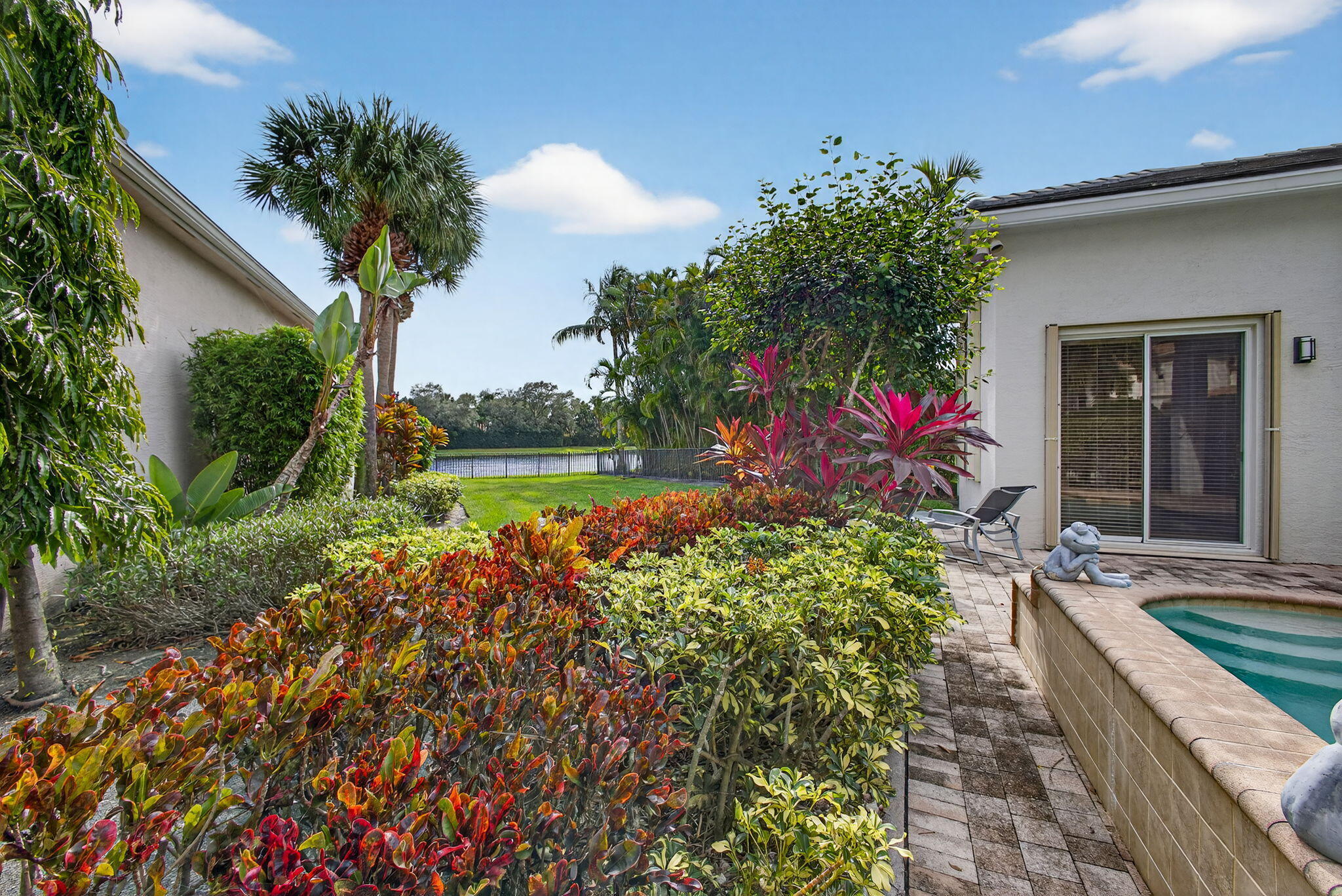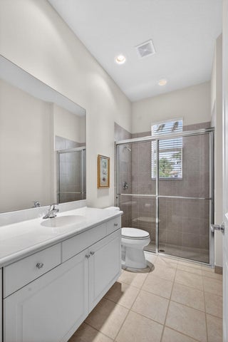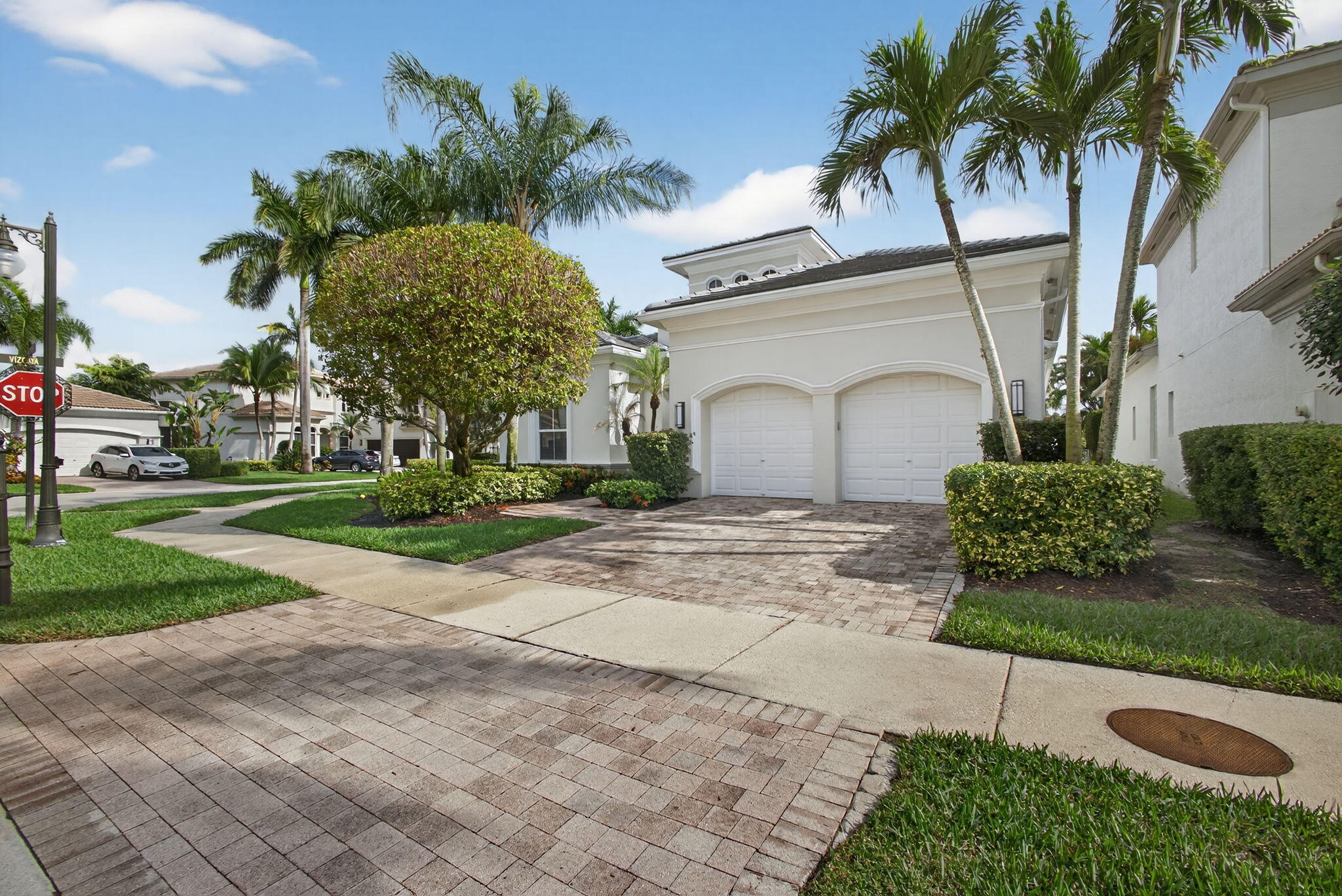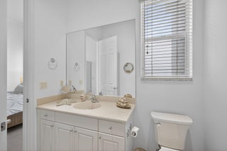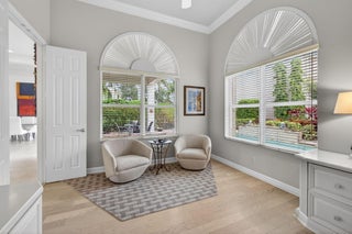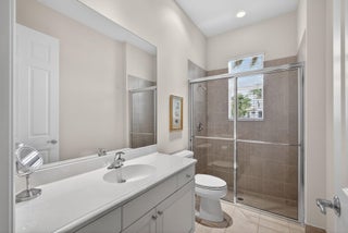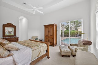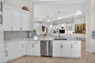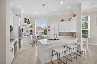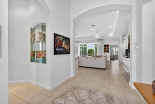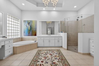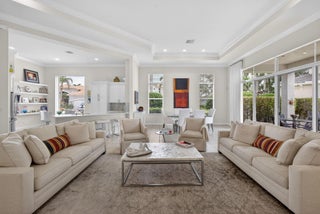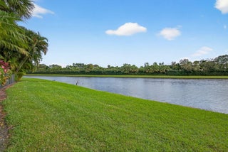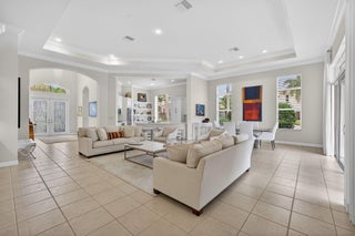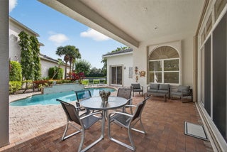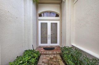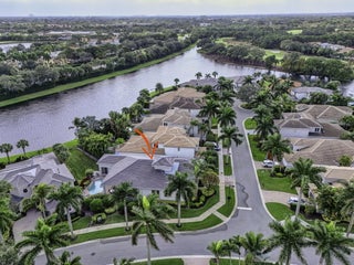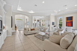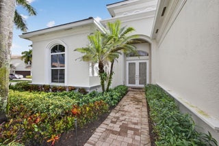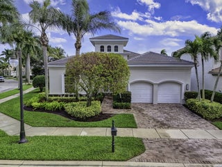 Exciting Country Club at Mirasol home with golf membership, set on an oversized, professionally landscaped cul-de-sac lot. Enjoy extended brick patios and a heated pool with waterfall, perfect for outdoor living. Soaring ceilings and a dramatic open floor plan offer ideal space for everyday living and entertaining. Features include three en-suite bedrooms plus a private powder room with marble sink and custom lighting. Crisp all-white interior painted in 2023 with crown molding and recessed lighting. The primary bath was renovated in 2024 and includes an expansive walk-in closet. White kitchen and bar remodeled in 2023 with updated appliances. New roof, gutters, and two AC units (2024a''2025). Library with custom cabinetry, central vacuum, hurricane protection, impact front windows.