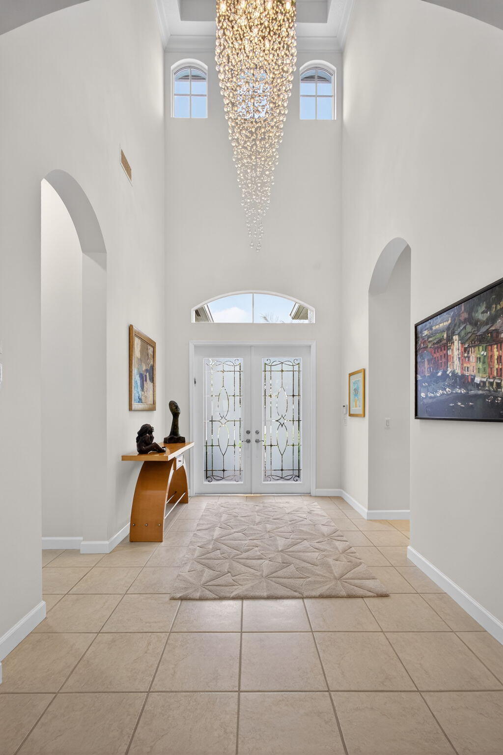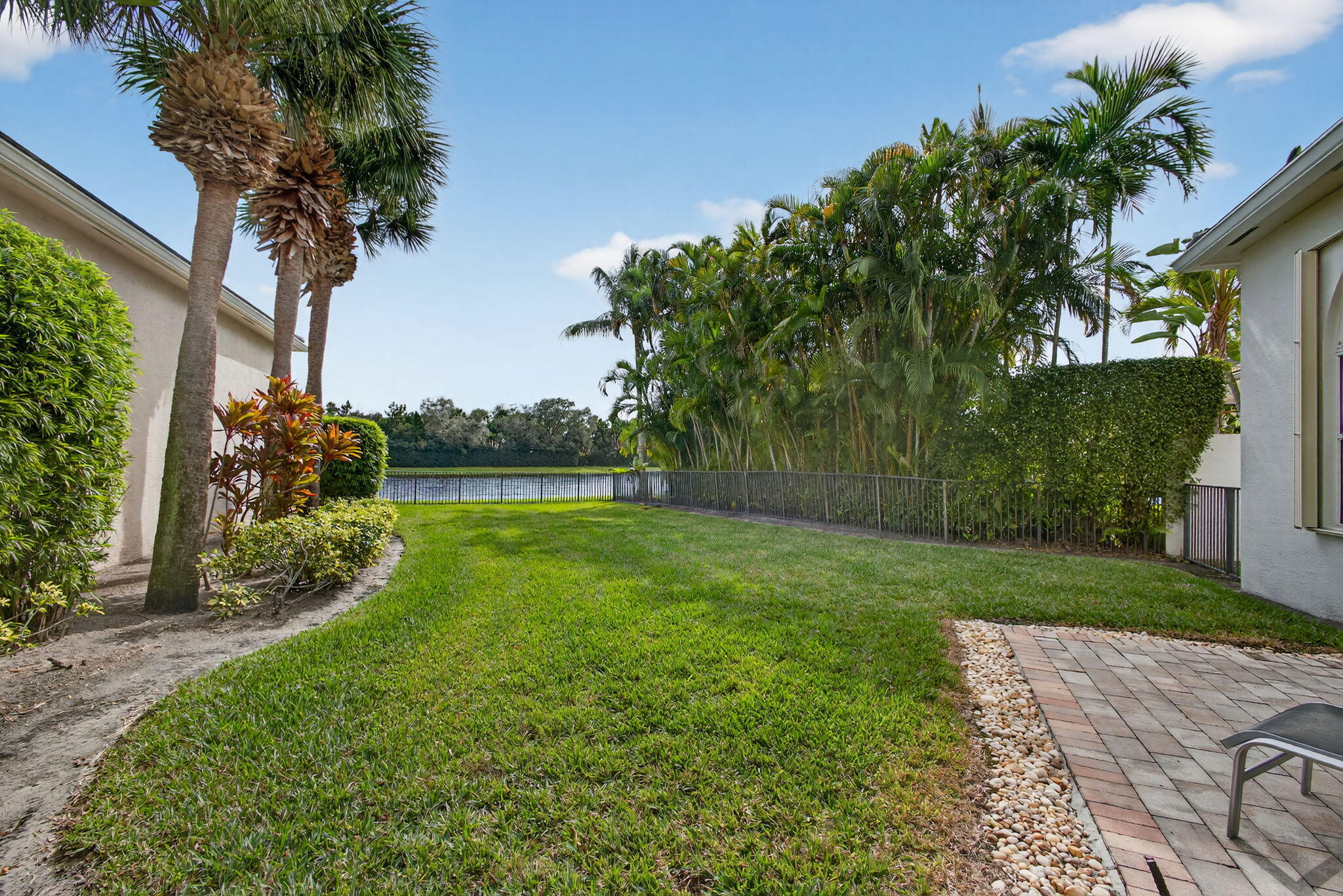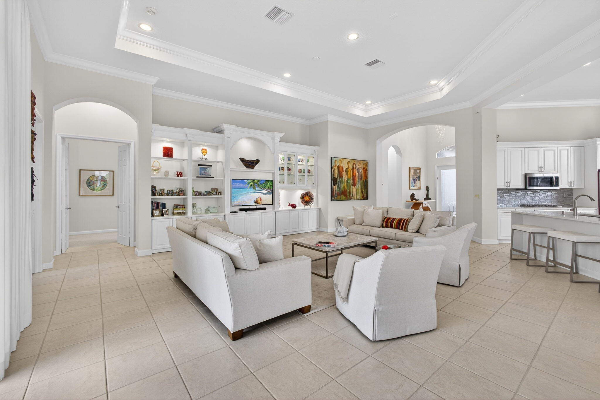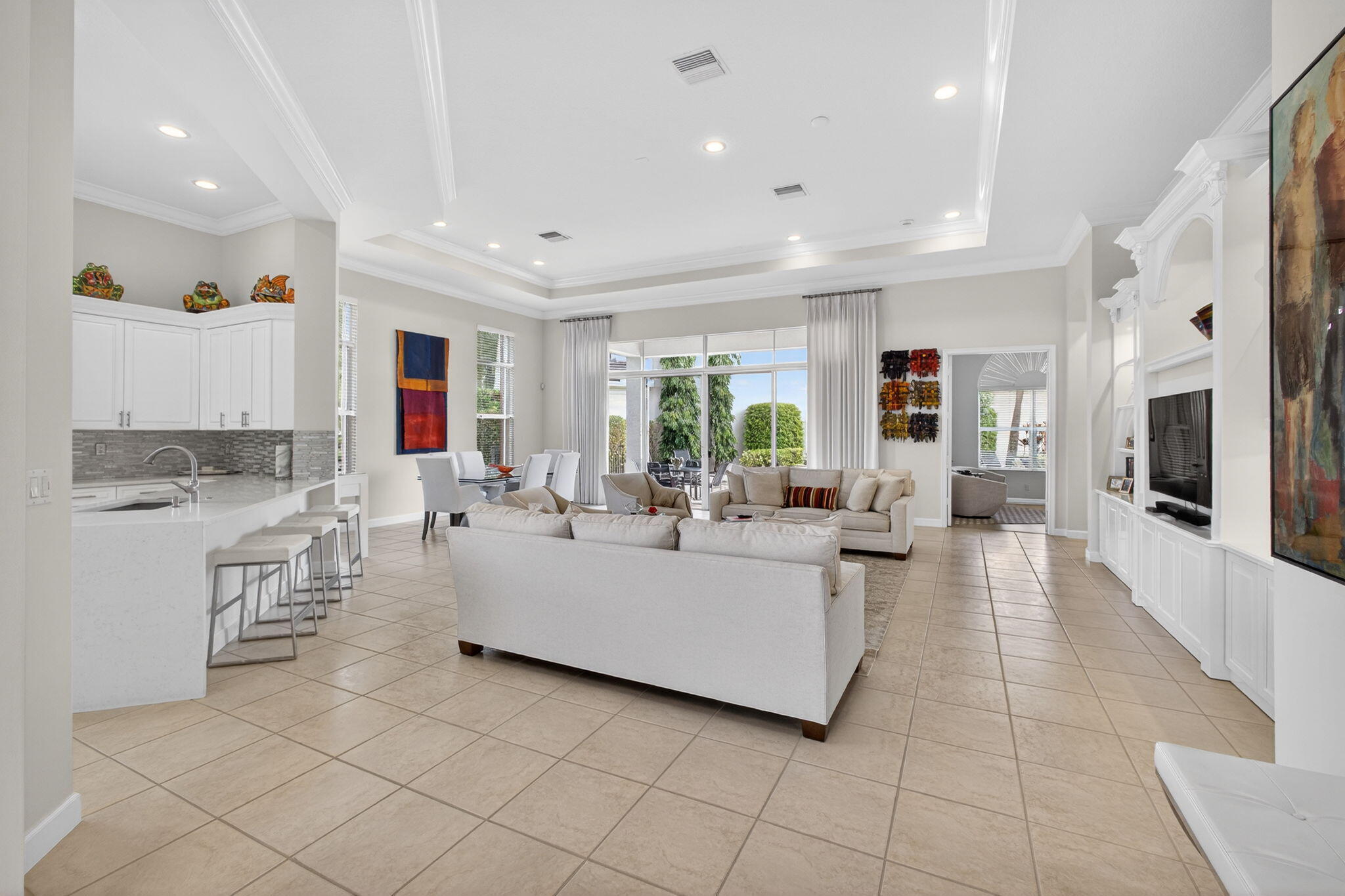 Exciting Country Club at Mirasol home with golf membership, set on an oversized, professionally landscaped cul-de-sac lot. Enjoy extended brick patios and a heated pool with waterfall, perfect for outdoor living. Soaring ceilings and a dramatic open floor plan offer ideal space for everyday living and entertaining. Features include three en-suite bedrooms plus a private powder room with marble sink and custom lighting. Crisp all-white interior painted in 2023 with crown molding and recessed lighting. The primary bath was renovated in 2024 and includes an expansive walk-in closet. White kitchen and bar remodeled in 2023 with updated appliances. New roof, gutters, and two AC units (2024a''2025). Library with custom cabinetry, central vacuum, hurricane protection, impact front windows.